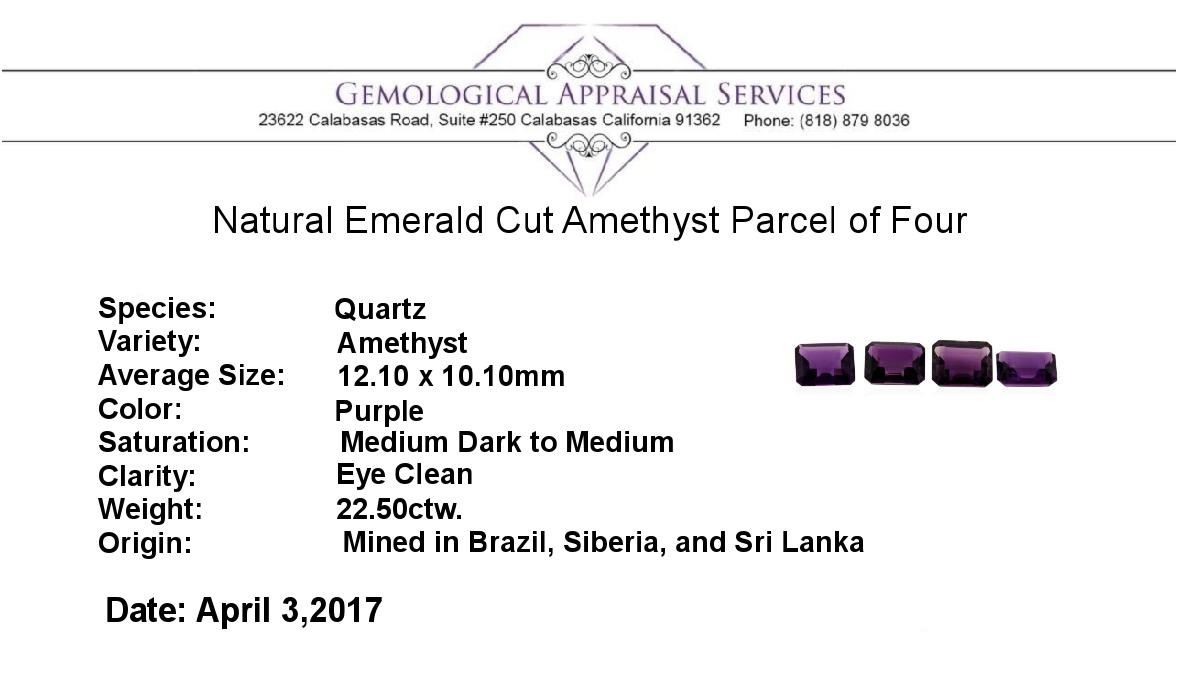 One natural emerald cut amethyst parcel of four with an exact weight of 22.50ctw., clarity is eye clean, purple, medium dark to medium. Gemological Appraisals Services estimates the retail value at $765 GAS Appraised.