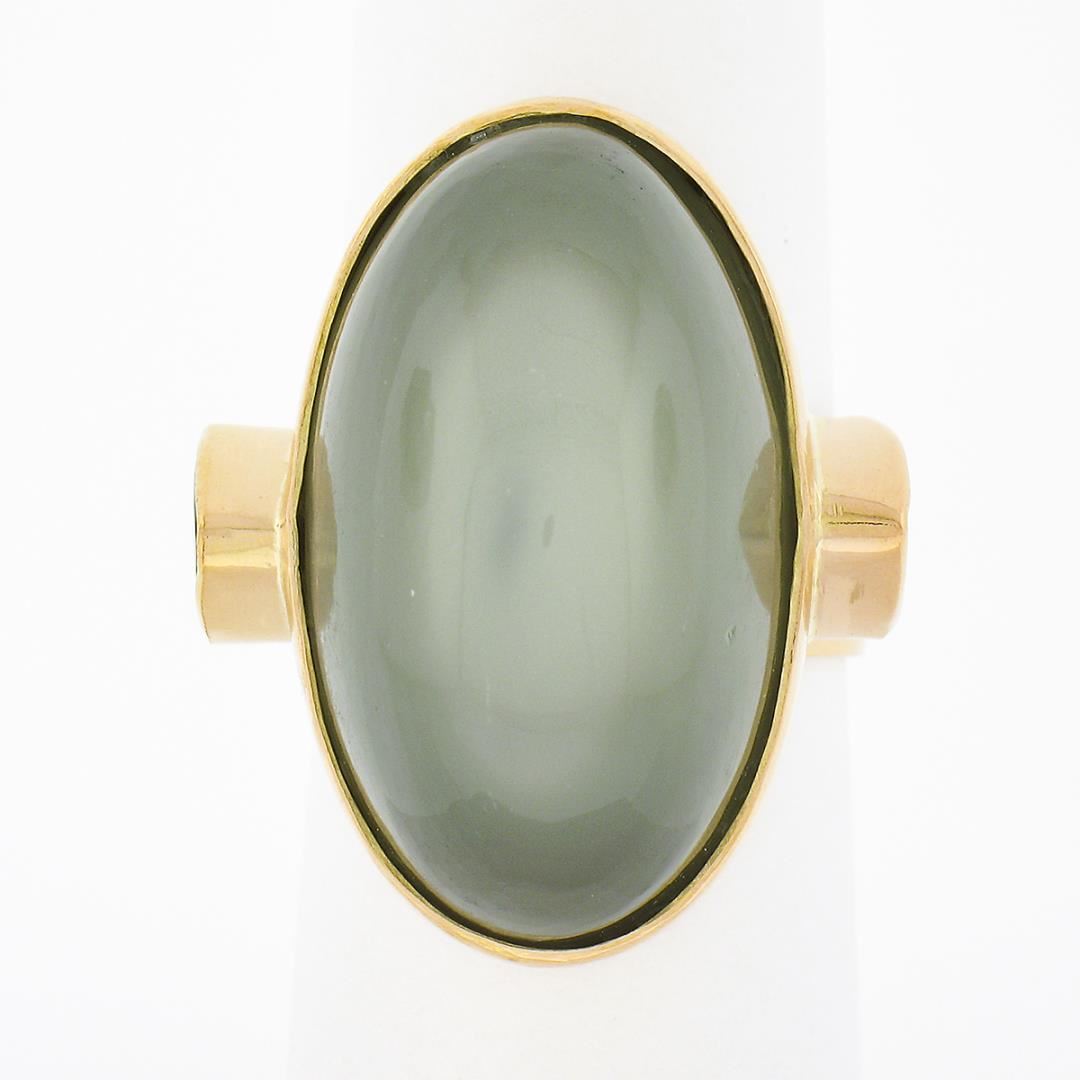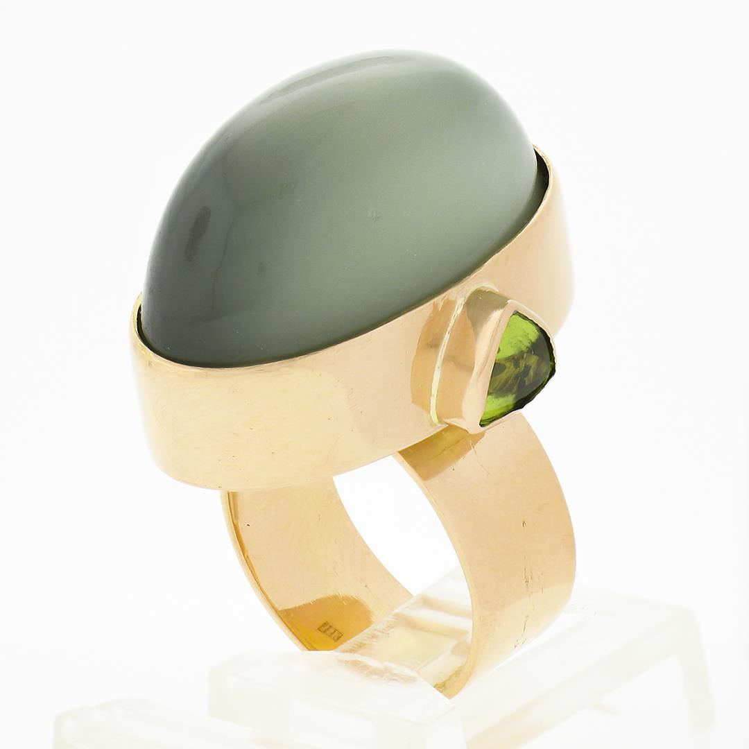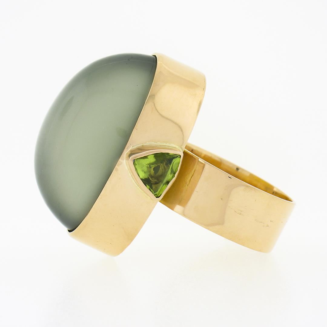 A solid 22k yellow gold cocktail ring, with 1 GIA graded oval cabochon cut natural cat's eye moonstone (25.10 x 14.62 mm), & 2 trillion cabochon cut natural peridots (6.1x6.1mm each ).. The ring is size 6.5, weighs a total of 19.78 grams, and measures 26.80mm wide. Comes with all original relevant certifications.