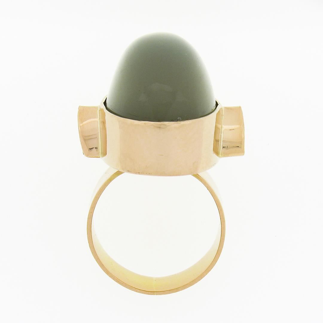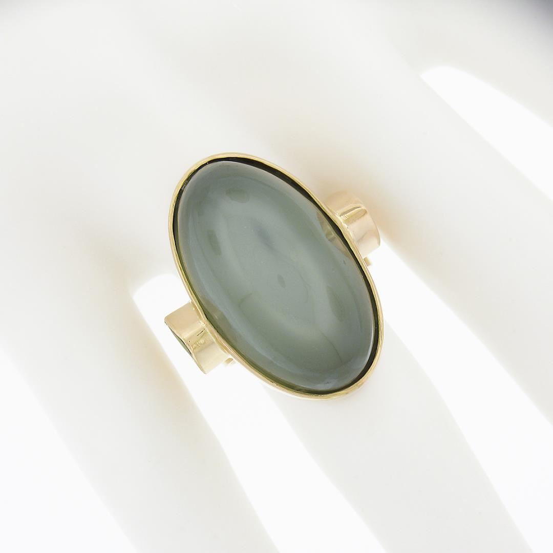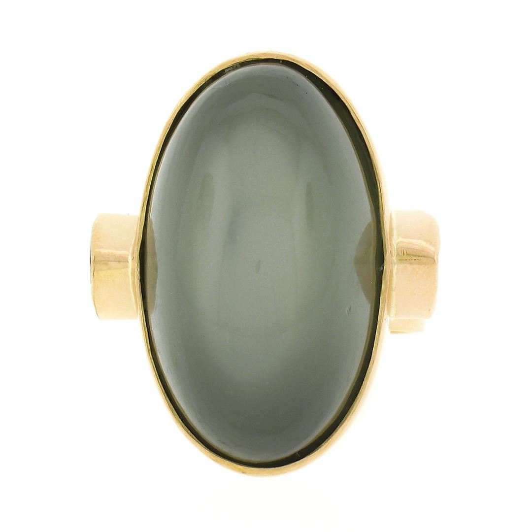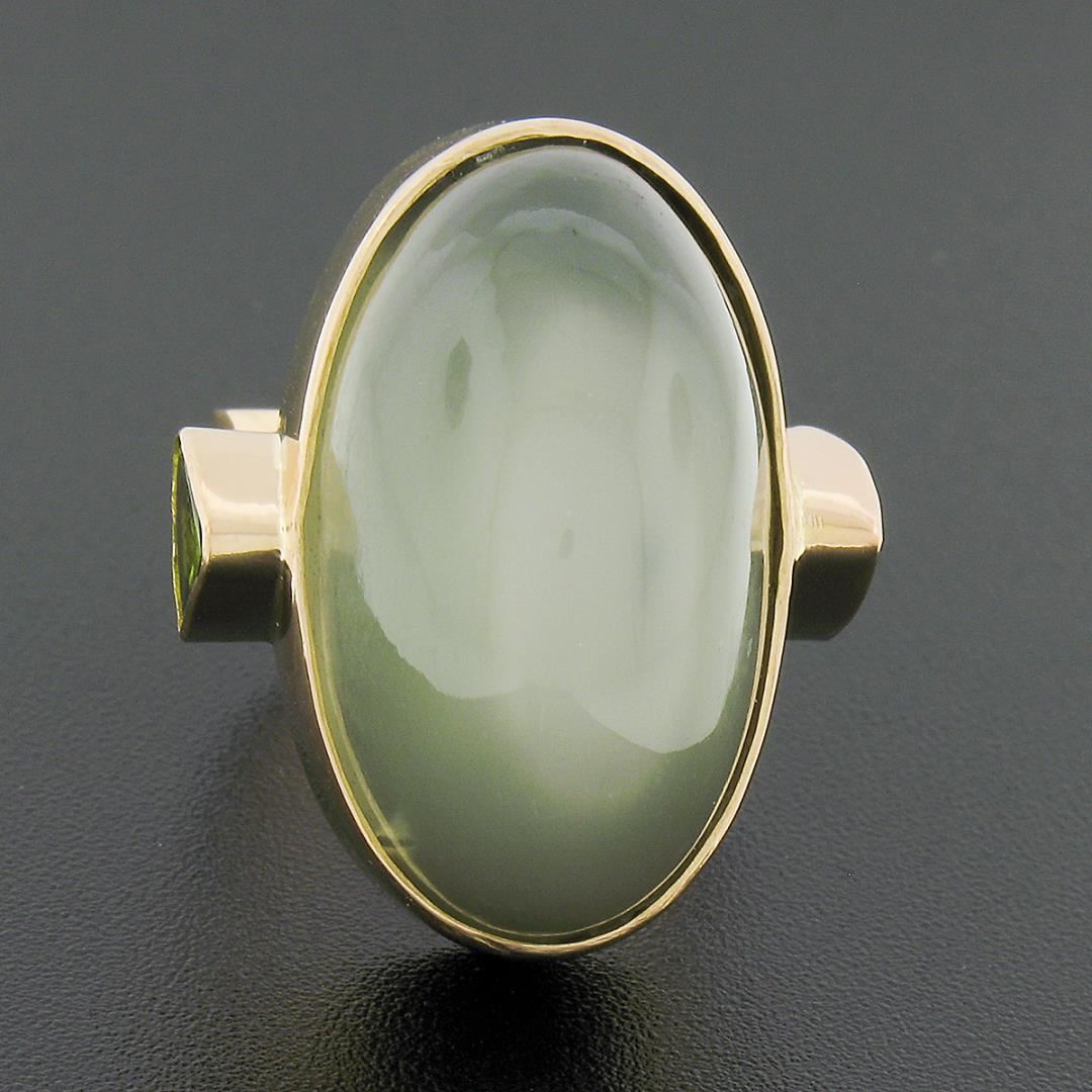 A solid 22k yellow gold cocktail ring, with 1 GIA graded oval cabochon cut natural cat's eye moonstone (25.10 x 14.62 mm), & 2 trillion cabochon cut natural peridots (6.1x6.1mm each ).. The ring is size 6.5, weighs a total of 19.78 grams, and measures 26.80mm wide. Comes with all original relevant certifications.