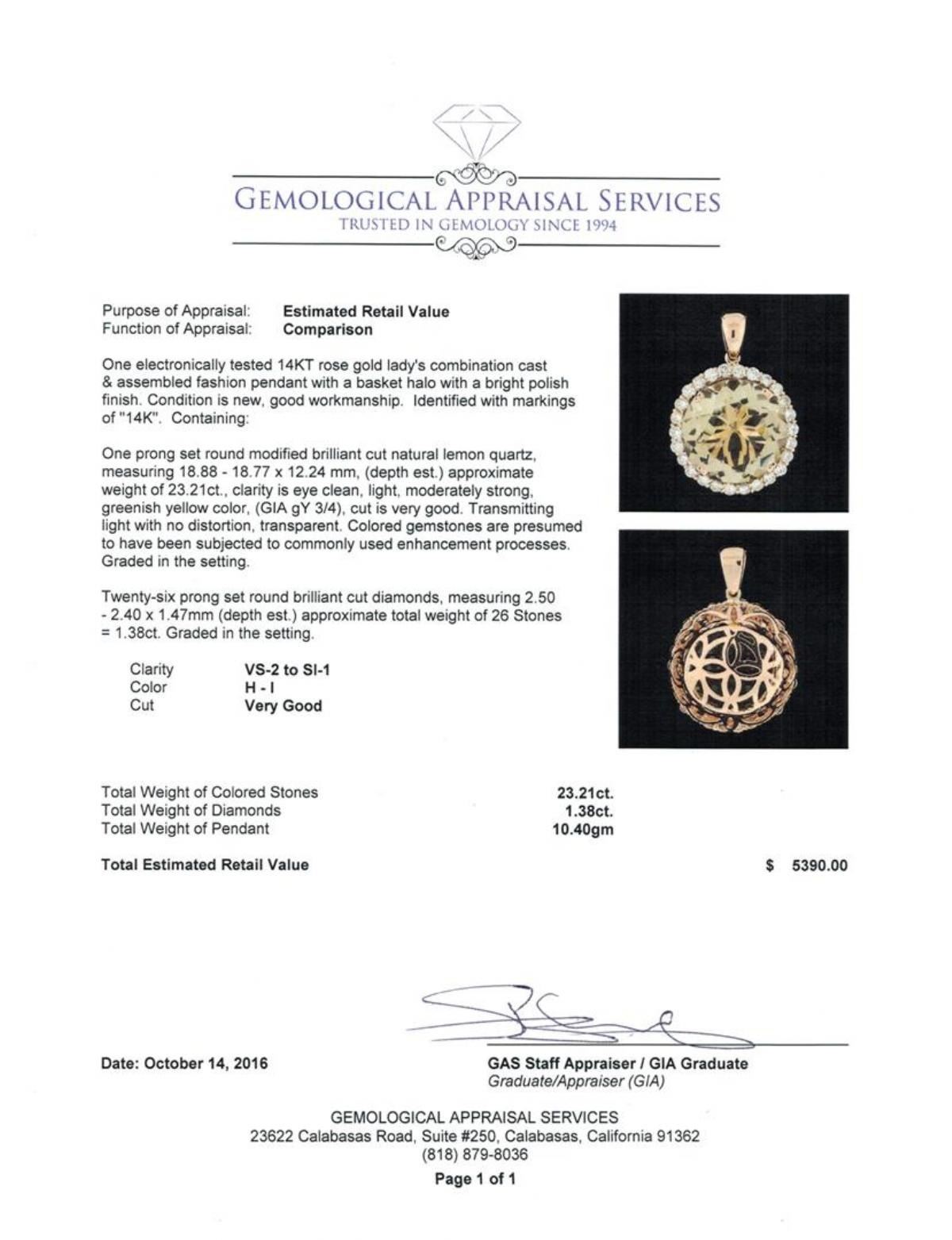 One electronically tested 14KT rose gold lady's combination cast & assembled fashion pendant with a basket halo with a bright polish finish. Identified with markings of '14K'. Condition is new, good workmanship. Containing: One prong set round modified brilliant cut natural lemon quartz, measuring 18.88 - 18.77 x 12.24 mm, (depth est.) approximate weight of 23.21ct., clarity is eye clean, light, moderately strong, greenish yellow color, (GIA gY 3/4), cut is very good. Transmitting light with no distortion, transparent. Colored gemstones are presumed to have been subjected to commonly used enhancement processes. Graded in the setting. Twenty-Six prong set round brilliant cut diamonds, measuring 2.50 - 2.40 x 1.47mm (depth est.) approximate total weight of 26 Stones = 1.38ct. Graded in the setting. Clarity VS-2 to SI-1. Color: H - I Cut Very Good. Total Weight of Colored Stones 23.21ct.. Total Weight of Diamonds 1.38ct.. Total Weight of Pendant 10.40gm. GAS Appraised at $5,390.00.