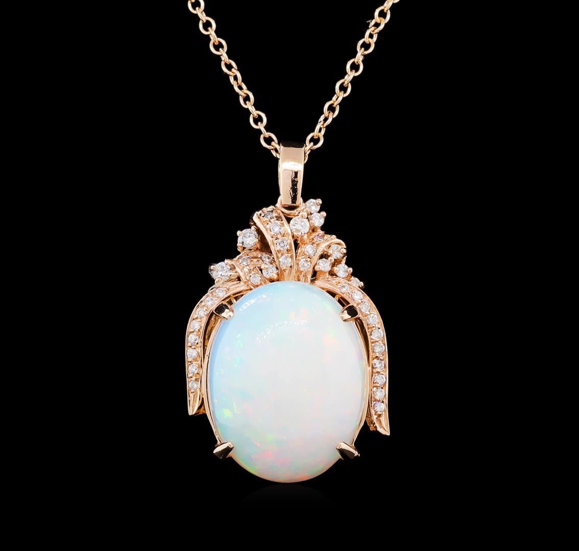 One electronically tested 14KT rose gold lady's combination cast & assembled fashion pendant & chain 20.0" long, 2.2mm round cable link with a lobster claw clasp with a bright polish finish. Identified with markings of "14K". Condition is new, good workmanship. Containing: Three prong set round brilliant cut diamonds, measuring 2.60 - 2.55 x 1.60mm (depth est.) approximate total weight of 3 Stones = 0.20ct. Graded in the setting. Clarity: SI-1 to SI-2. Color: H - I. Cut Good Six prong set round brilliant cut diamonds, measuring 2.00 - 1.90 x 1.17mm (depth est.) approximate total weight of 6 Stones = 0.16ct. Graded in the setting. Clarity: SI-1 to SI-2. Color: H - I. Cut Good One crystal opal that is cut in a oval shaped cabochon and is prong set, measuring 25.85 mm long x 20.28 mm wide, and 11.71 mm thick and the approximate weight is 23.65 carats. The opal has a somewhat bright, multicolor play of color (fire) in a rolling flashfire pattern; a medium dome; a good cut; no inclusions; slight variation in base in its brightness and pattern; and is not directional. Graded in the setting. Twenty-Eight prong set round brilliant cut diamonds, measuring 1.60 - 1.55 x 0.98mm (depth est.) approximate total weight of 28 Stones = 0.42ct. Graded in the setting. Clarity: SI-1 to SI-2. Color: H - I. Cut Good. Total Weight of Diamonds 0.78ct. Total Weight of Opals 23.65ct. Total Weight of Pendant & Chain 20.70gm. GAS Appraised.