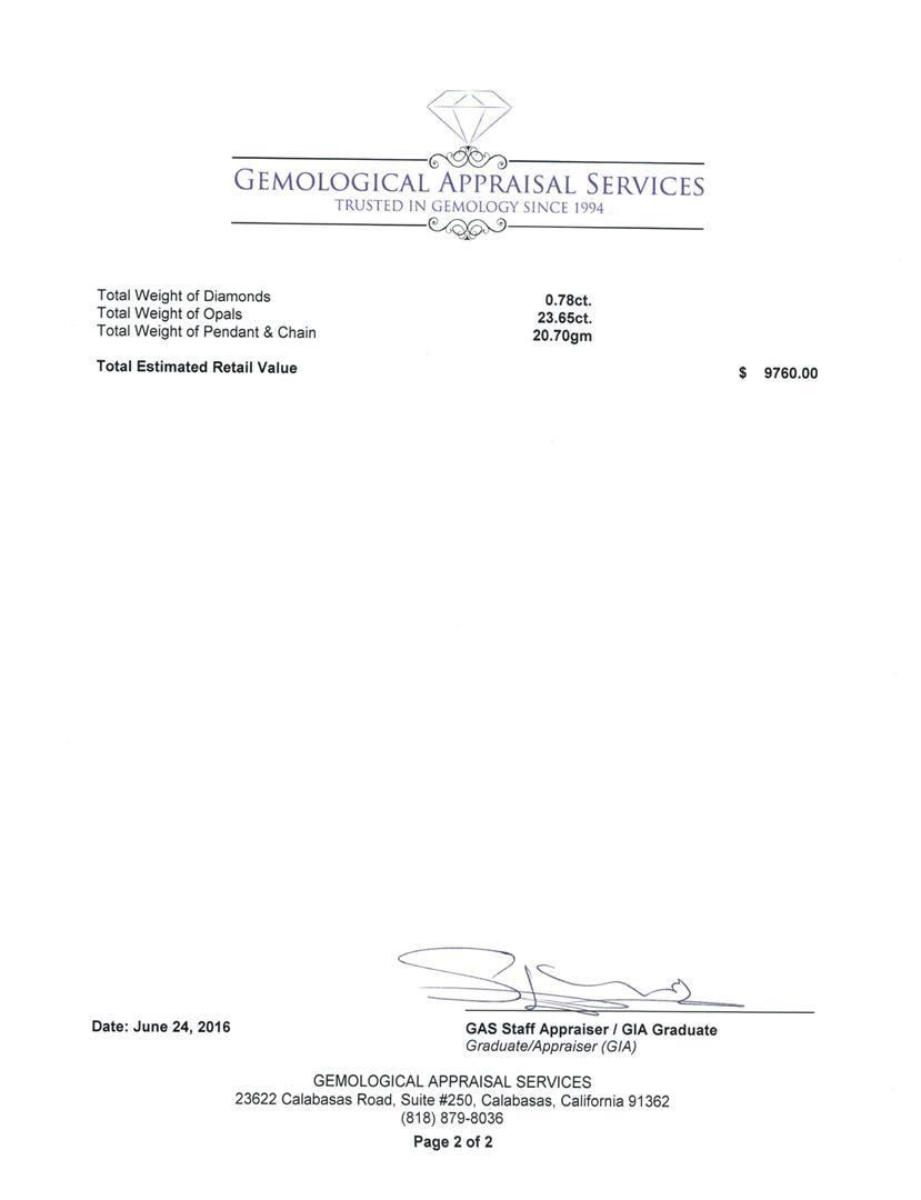 One electronically tested 14KT rose gold lady's combination cast & assembled fashion pendant & chain 20.0" long, 2.2mm round cable link with a lobster claw clasp with a bright polish finish. Identified with markings of "14K". Condition is new, good workmanship. Containing: Three prong set round brilliant cut diamonds, measuring 2.60 - 2.55 x 1.60mm (depth est.) approximate total weight of 3 Stones = 0.20ct. Graded in the setting. Clarity: SI-1 to SI-2. Color: H - I. Cut Good Six prong set round brilliant cut diamonds, measuring 2.00 - 1.90 x 1.17mm (depth est.) approximate total weight of 6 Stones = 0.16ct. Graded in the setting. Clarity: SI-1 to SI-2. Color: H - I. Cut Good One crystal opal that is cut in a oval shaped cabochon and is prong set, measuring 25.85 mm long x 20.28 mm wide, and 11.71 mm thick and the approximate weight is 23.65 carats. The opal has a somewhat bright, multicolor play of color (fire) in a rolling flashfire pattern; a medium dome; a good cut; no inclusions; slight variation in base in its brightness and pattern; and is not directional. Graded in the setting. Twenty-Eight prong set round brilliant cut diamonds, measuring 1.60 - 1.55 x 0.98mm (depth est.) approximate total weight of 28 Stones = 0.42ct. Graded in the setting. Clarity: SI-1 to SI-2. Color: H - I. Cut Good. Total Weight of Diamonds 0.78ct. Total Weight of Opals 23.65ct. Total Weight of Pendant & Chain 20.70gm. GAS Appraised.
