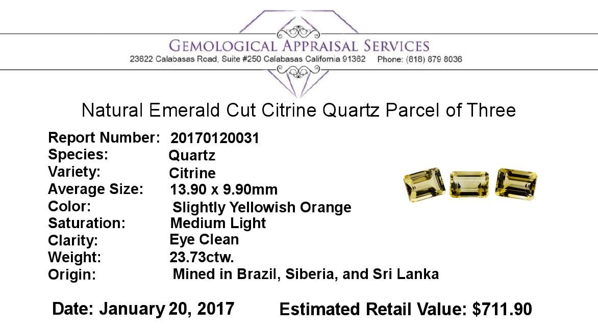 One natural emerald cut citrine quartz parcel of three with an exact weight of 23.73ctw., clarity is eye clean, slightly yellowish orange, medium light. Gemological Appraisals Services estimates the retail value at $711.9 GAS Appraised.