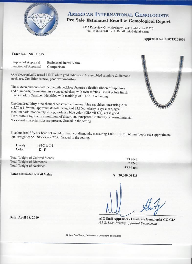 One 23.86ctw Sapphire and Diamond Necklace - 14KT White Gold. AIG certified. See Appraisal for more details. AIG Appraised.