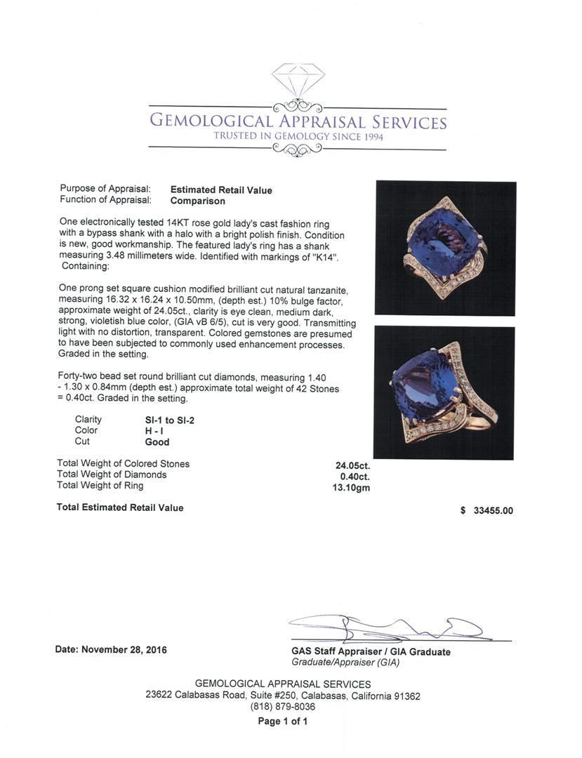 One electronically tested 14KT rose gold lady's cast fashion ring with a bypass shank with a halo with a bright polish finish. The featured lady's ring has a shank measuring 3.48 millimeters wide. Identified with markings of 'K14'. Condition is new, good workmanship. Containing: One prong set square cushion modified brilliant cut natural tanzanite, measuring 16.32 x 16.24 x 10.50mm, (depth est.) 10%. bulge factor, approximate weight of 24.05ct., clarity is eye clean, medium dark, strong, violetish blue color, (GIA vB 6/5), cut is very good. Transmitting light with no distortion, transparent. Colored gemstones are presumed to have been subjected to commonly used enhancement processes. Graded in the setting. Forty-Two bead set round brilliant cut diamonds, measuring 1.40 - 1.30 x 0.84mm (depth est.) approximate total weight of 42 Stones = 0.40ct. Graded in the setting. Clarity SI-1 to SI-2. Color: H - I Cut Good. Total Weight of Colored Stones 24.05ct.. Total Weight of Diamonds 0.40ct.. Total Weight of Ring 13.10gm. GAS Appraised.
