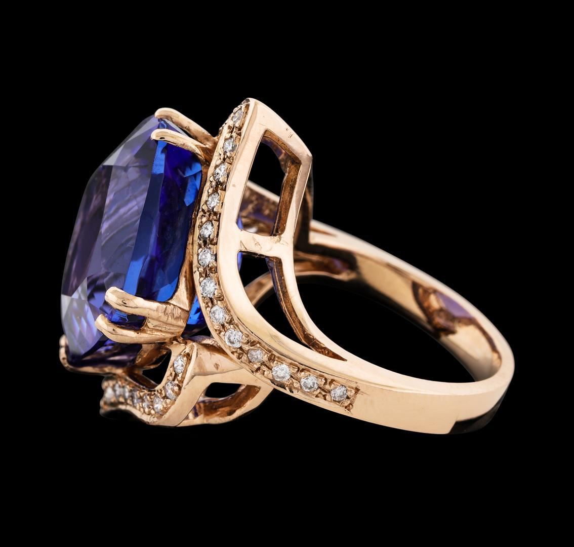 One electronically tested 14KT rose gold lady's cast fashion ring with a bypass shank with a halo with a bright polish finish. The featured lady's ring has a shank measuring 3.48 millimeters wide. Identified with markings of 'K14'. Condition is new, good workmanship. Containing: One prong set square cushion modified brilliant cut natural tanzanite, measuring 16.32 x 16.24 x 10.50mm, (depth est.) 10%. bulge factor, approximate weight of 24.05ct., clarity is eye clean, medium dark, strong, violetish blue color, (GIA vB 6/5), cut is very good. Transmitting light with no distortion, transparent. Colored gemstones are presumed to have been subjected to commonly used enhancement processes. Graded in the setting. Forty-Two bead set round brilliant cut diamonds, measuring 1.40 - 1.30 x 0.84mm (depth est.) approximate total weight of 42 Stones = 0.40ct. Graded in the setting. Clarity SI-1 to SI-2. Color: H - I Cut Good. Total Weight of Colored Stones 24.05ct.. Total Weight of Diamonds 0.40ct.. Total Weight of Ring 13.10gm. GAS Appraised.