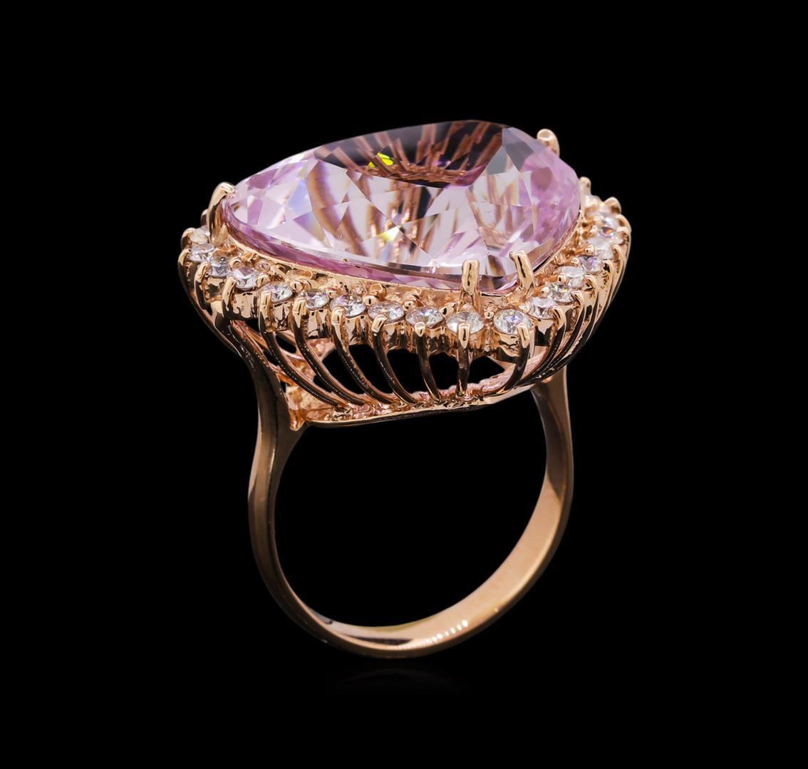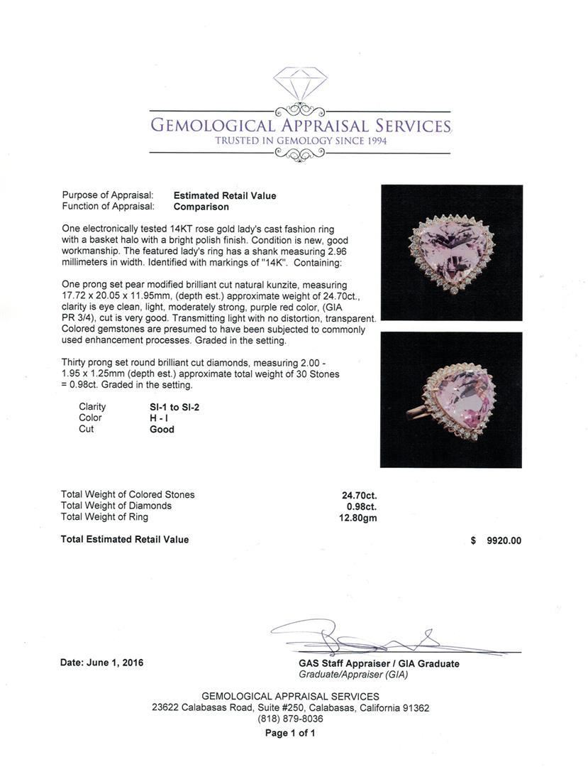 One electronically tested 14KT rose gold lady's cast fashion ring with a basket halo with a bright polish finish. The featured lady's ring has a shank measuring 2.96 millimeters in width. Identified with markings of "14K". Condition is new, good workmanship. Containing: One prong set pear modified brilliant cut natural kunzite, measuring 17.72 x 20.05 x 11.95mm, (depth est.) approximate weight of 24.70ct., clarity is eye clean, light, moderately strong, purple red color, (GIA PR 3/4), cut is very good. Transmitting light with no distortion, transparent. Colored gemstones are presumed to have been subjected to commonly used enhancement processes. Graded in the setting. Thirty prong set round brilliant cut diamonds, measuring 2.00 - 1.95 x 1.25mm (depth est.) approximate total weight of 30 Stones = 0.98ct. Graded in the setting. Clarity: SI-1 to SI-2. Color: H - I. Cut Good. Total Weight of Colored Stones 24.70ct. Total Weight of Diamonds 0.98ct. Total Weight of Ring 12.80gm. GAS Appraised.