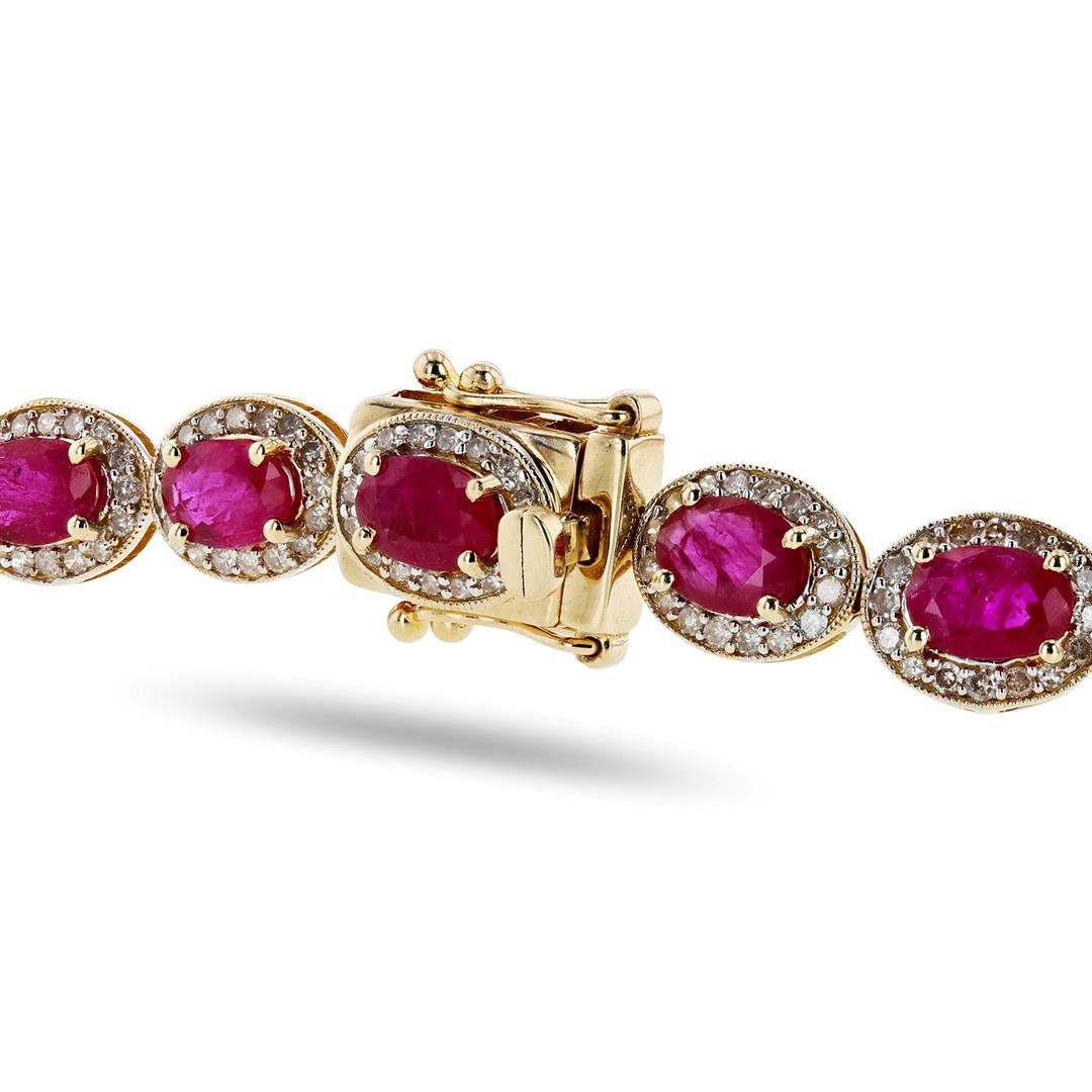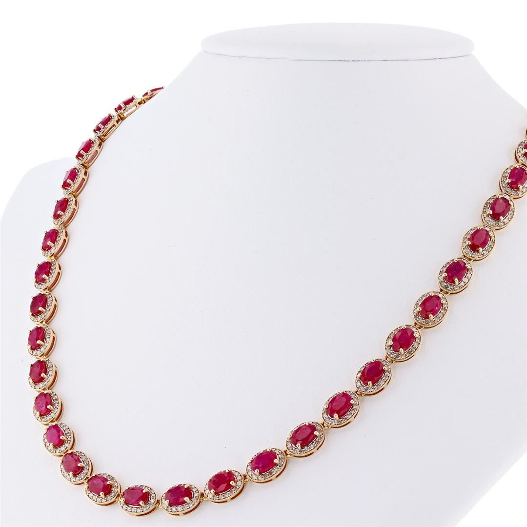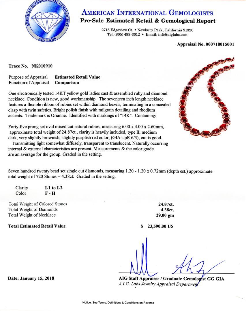 One electronically tested 14KT yellow gold ladies cast and assembled ruby and diamond necklace. Condition is new, good workmanship. The seventeen inch length necklace features a flexible ribbon of rubies set within diamond bezels, terminating in a concealed clasp with twin safeties. Bright polish finish with milgrain detailing and rhodium accents. Trademark is Orianne. Identified with markings of "14K". Containing: Forty-five prong set oval mixed cut natural rubies, measuring 6.00 x 4.00 x 2.60mm, approximate total weight of 24.87ct., clarity is heavily included, type II, medium dark, very slightly brownish, slightly purplish red color, (GIA slpR 6/3), cut is good. Transmitting light somewhat diffusely, transparent to translucent. Naturally occurring internal and external characteristics are present. Measurements and the color grade are an average for the group. Graded in the setting. Seven hundred twenty bead set single cut diamonds, measuring 1.20 - 1.20 x 0.72mm (depth est.) approximate total weight of 720 Stones = 4.38ct. Graded in the setting. Clarity I-1 to I-2 Color F-H Total Weight of Colored Stones 24.87ct. Total Weight of Diamonds 4.38ct. Total Weight of Necklace 29.00 gm