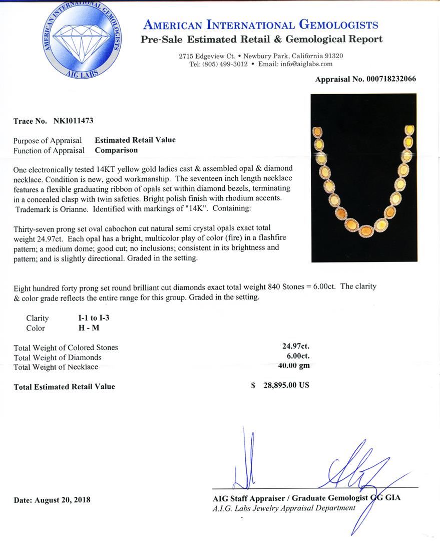One electronically tested 14KT yellow gold ladies cast and assembled opal and diamond necklace. Condition is new, good workmanship. The seventeen inch length necklace features a flexible graduating ribbon of opals set within diamond bezels, terminating in a concealed clasp with twin safeties. Bright polish finish with rhodium accents. Trademark is Orianne. Identified with markings of "14K". Containing: Thirty-seven prong set oval cabochon cut natural semi crystal opals exact total weight 24.97ct. Each opal has a bright, multicolor play of color (fire) in a flashfire pattern; a medium dome; good cut; no inclusions; consistent in its brightness and pattern; and is slightly directional. Graded in the setting. Eight hundred forty prong set round brilliant cut diamonds exact total weight 840 Stones = 6.00ct. The clarity and color grade reflects the entire range for this group. Graded in the setting. Clarity I-1 to I-3 Color H - M Total Weight of Colored Stones 24.97ct. Total Weight of Diamonds 6.00ct. Total Weight of N ecklace 40.00 gm