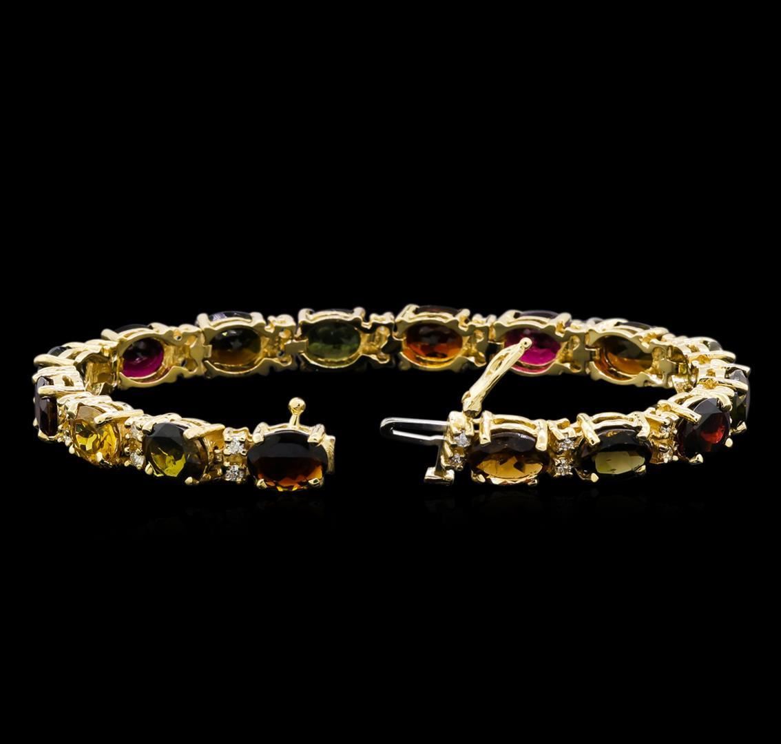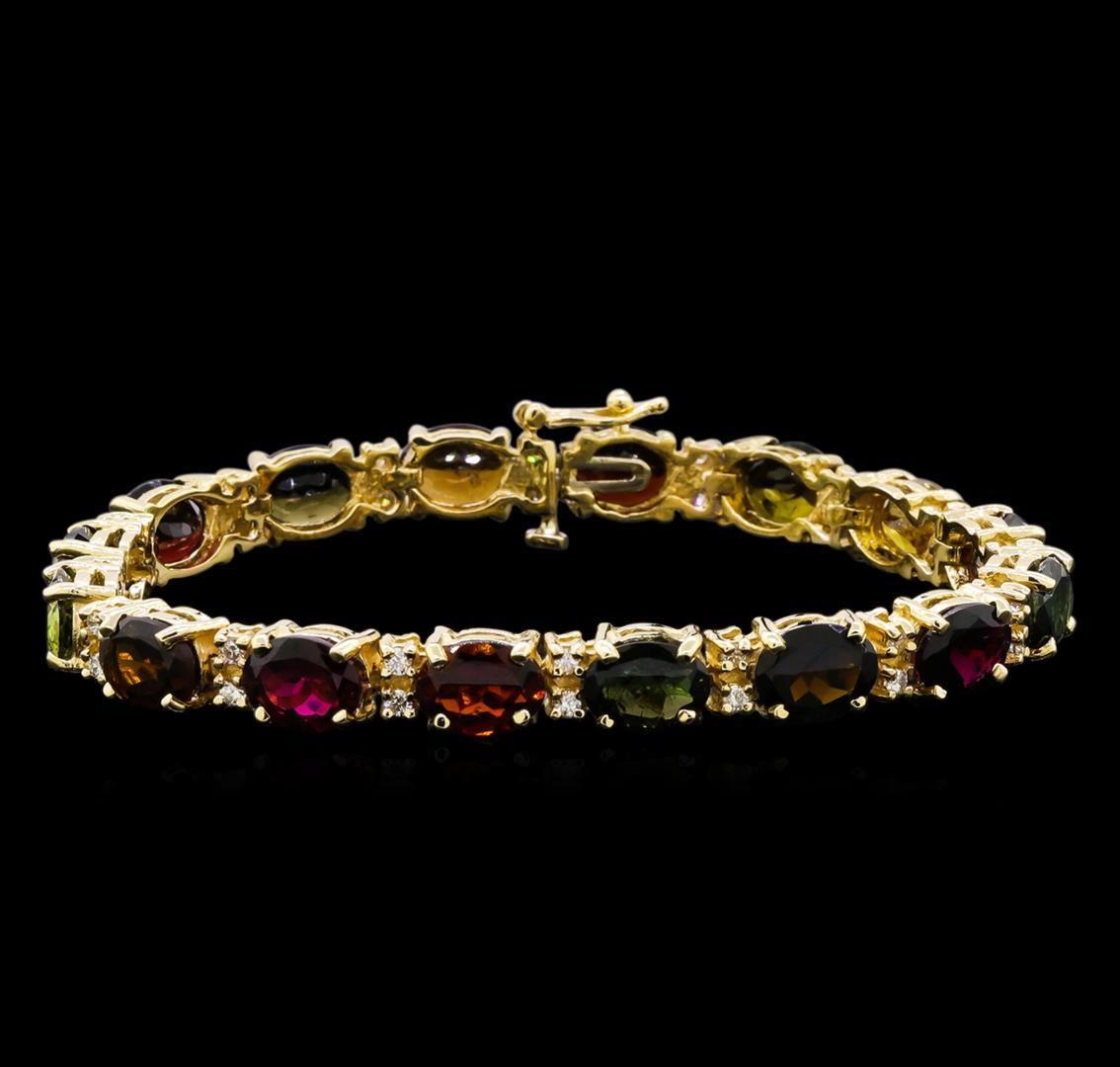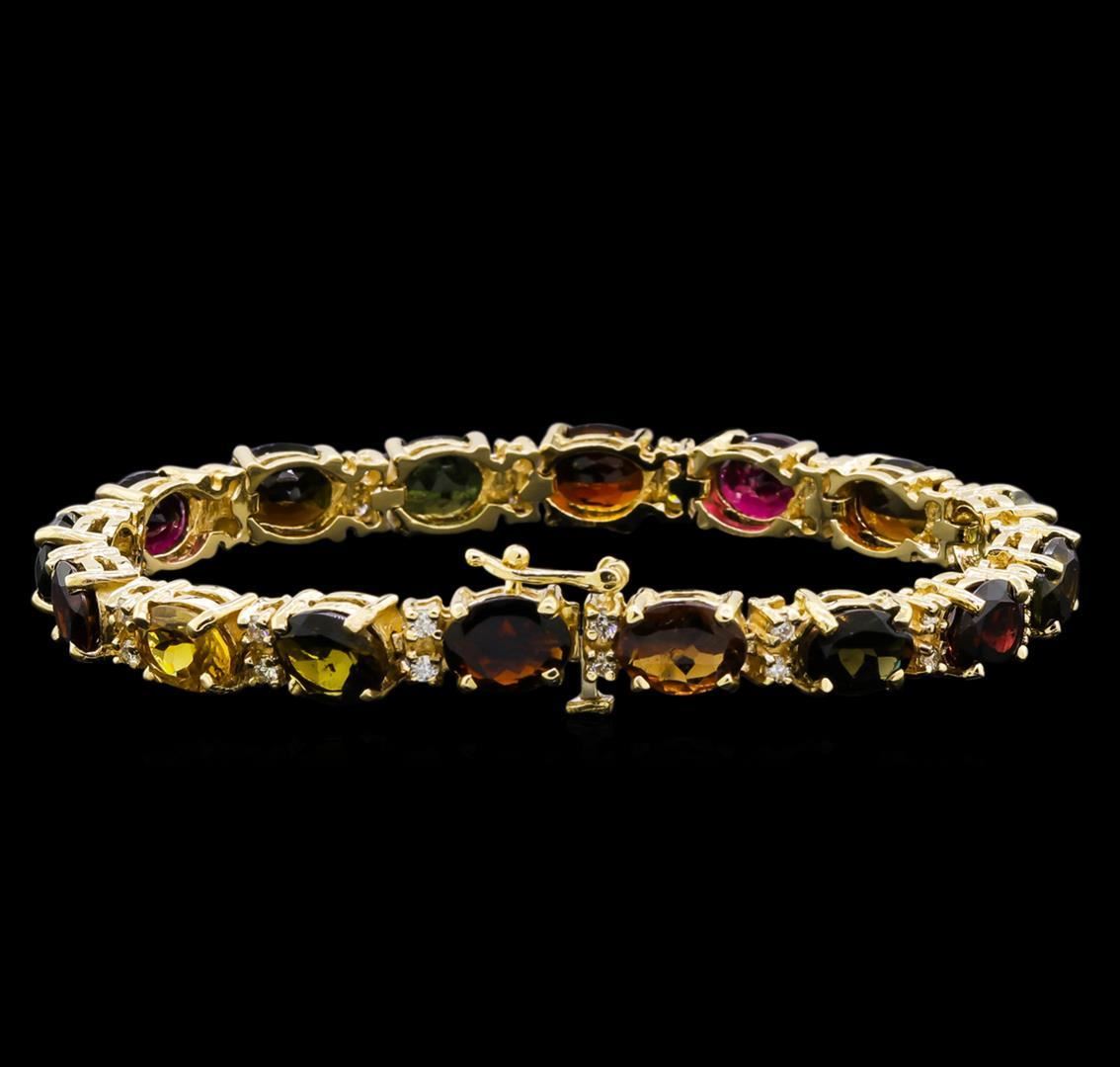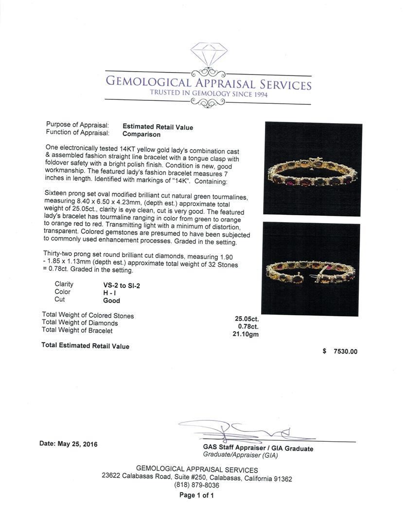 One electronically tested 14KT yellow gold lady's combination cast & assembled fashion straight line bracelet with a tongue clasp with foldover safety with a bright polish finish. The featured lady's fashion bracelet measures 7 inches in length. Identified with markings of "14K". Condition is new, good workmanship. Containing: Sixteen prong set oval modified brilliant cut natural green tourmalines, measuring 8.40 x 6.50 x 4.23mm, (depth est.) approximate total weight of 25.05ct., clarity is eye clean, cut is very good. The featured lady's bracelet has tourmaline ranging in color from green to orange to orange red to red. Transmitting light with a minimum of distortion, transparent. Colored gemstones are presumed to have been subjected to commonly used enhancement processes. Graded in the setting. Thirty-Two prong set round brilliant cut diamonds, measuring 1.90 - 1.85 x 1.13mm (depth est.) approximate total weight of 32 Stones = 0.78ct. Graded in the setting. Clarity: VS-2 to SI-2. Color: H - I. Cut Good. Total Weight of Colored Stones 25.05ct. Total Weight of Diamonds 0.78ct. Total Weight of Bracelet 21.10gm. GAS Appraised.