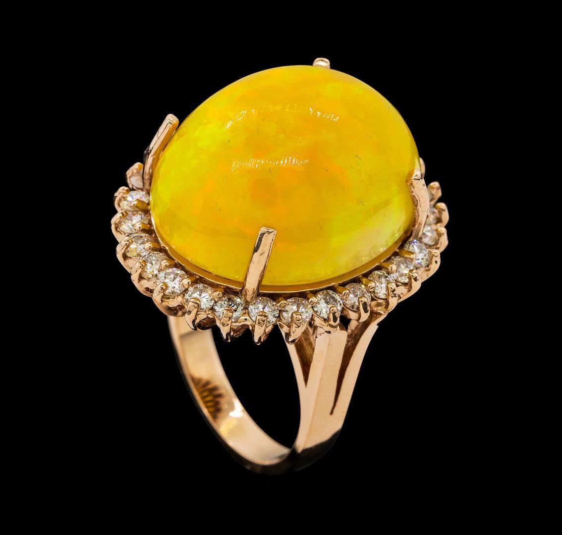 One electronically tested 14KT rose gold lady's cast fashion ring with a split shank basket halo with a bright polish finish. The featured lady's ring has a shank measuring 3.21 millimeters wide. Identified with markings of 'K14'. Condition is new, good workmanship. Containing: One orange crystal that is cut in a oval shaped cabochon and is prong set, measuring 21.81 mm long x 17.33 mm wide, and 13.50 mm thick and the approximate weight is 25.28 carats. The opal has a somewhat bright, orange-red play of color (fire) in a rolling flashfire pattern; a high dome; a good cut; no inclusions; slight variation in base in its brightness and pattern; and is not directional. Graded in the setting. Twenty-Eight prong set round brilliant cut diamonds, measuring 2.40 - 2.35 x 1.43mm (depth est.) approximate total weight of 28 Stones = 1.38ct. Graded in the setting. Clarity SI-1 to SI-2. Color: G - H Cut Good. Total Weight of Diamonds 1.38ct.. Total Weight of Opals 25.28ct.. Total Weight of Ring 14.90gm. GAS Appraised.
