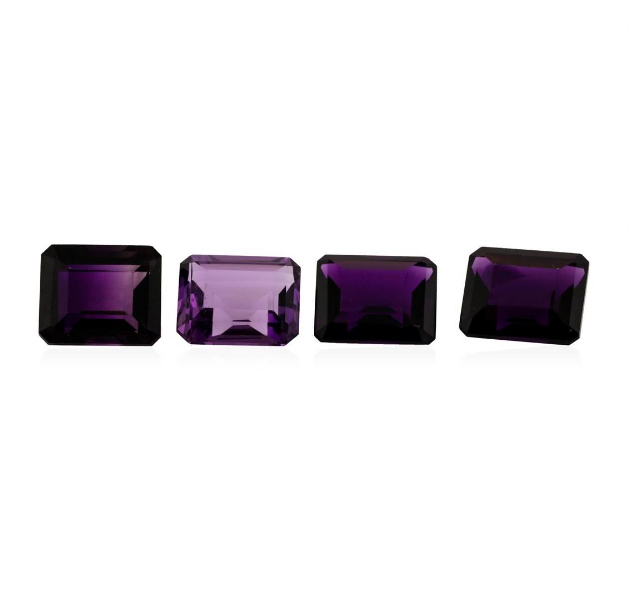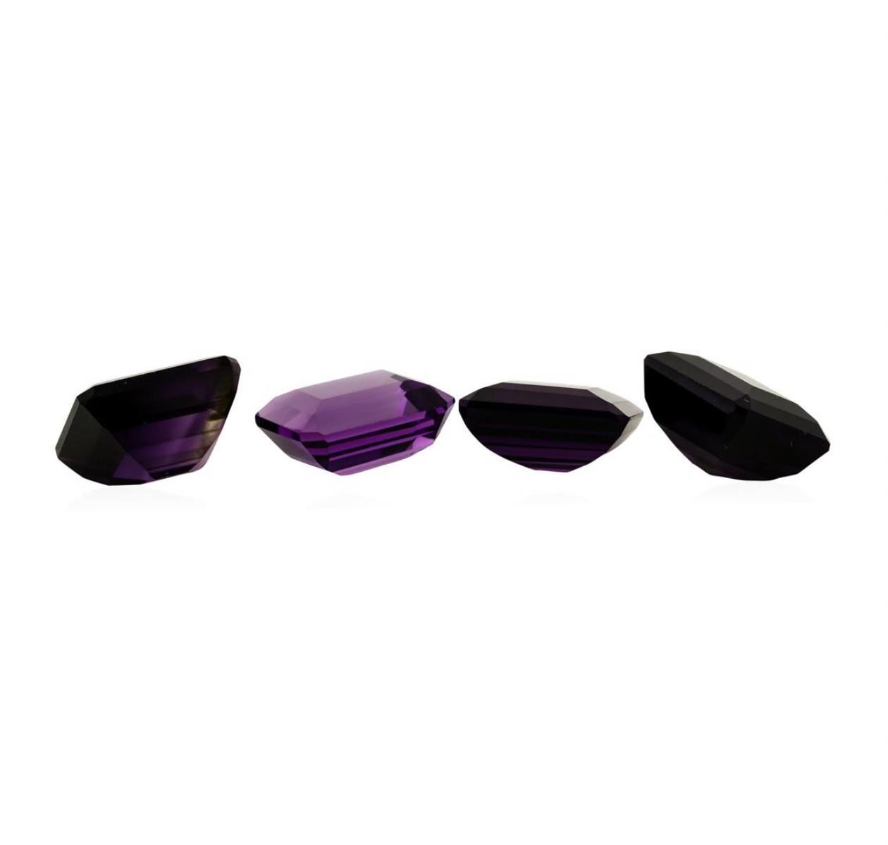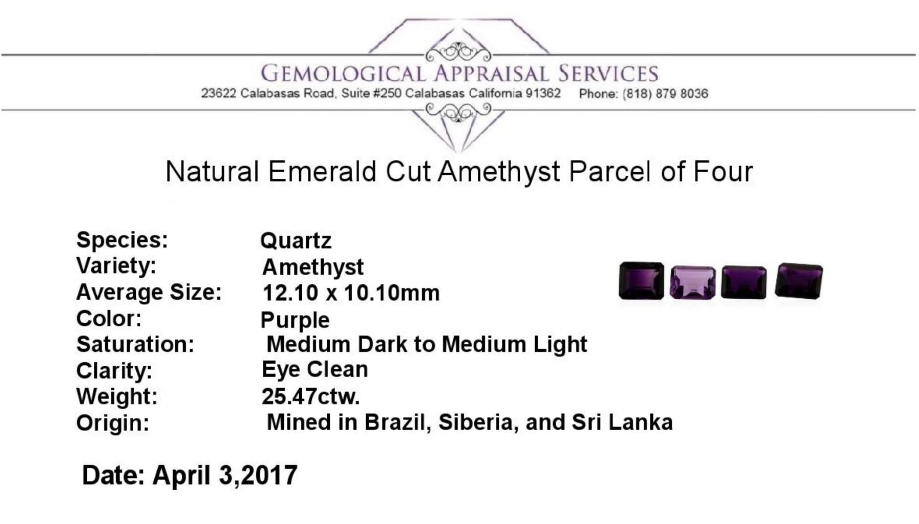 One natural emerald cut amethyst parcel of four with an exact weight of 25.47ctw., clarity is eye clean, purple, medium dark to medium light. Gemological Appraisals Services estimates the retail value at $764.1 GAS Appraised.