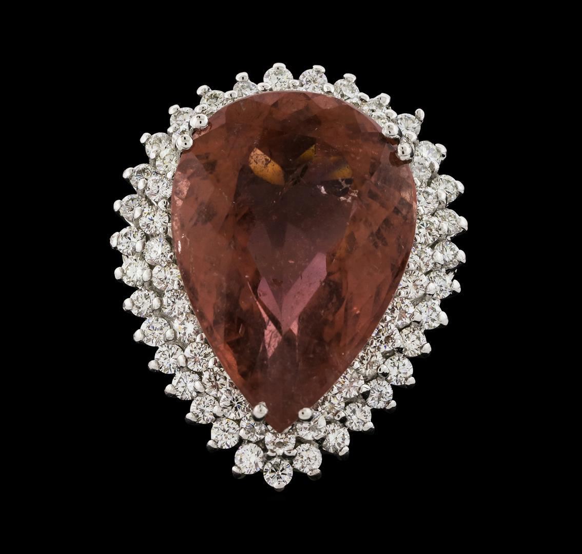 One 14KT White Gold "One of a Kind" Lady's Ring, 15.22 grams. Containing: Main Gemstones: Identity: Natural Tourmaline. Carat Weight: 25.76 cts tw. Shape & Measurement: Pear Shape. Quality: Fine Peach Color Tourmaline. Adjacent Gemstones: Identity: Natural Diamond. Shape: Round Brilliant Cut. Carat Weight: 2.15 cts tw. Quality: VS-SI Clarity, G-H Color. All fine cutting and proportions. Total Gemstones Weight: 27.91 cts tw. RBGS Appraised.