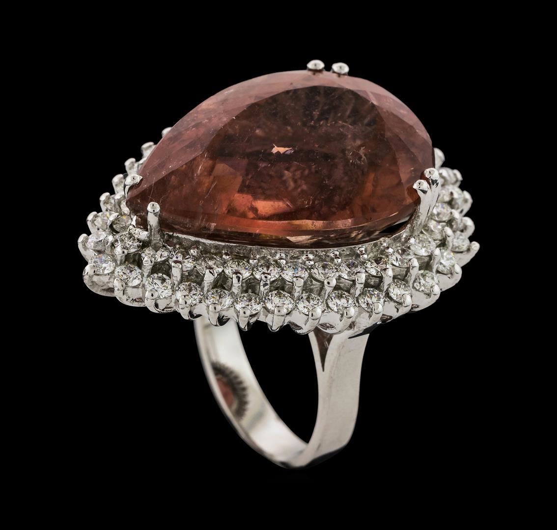 One 14KT White Gold "One of a Kind" Lady's Ring, 15.22 grams. Containing: Main Gemstones: Identity: Natural Tourmaline. Carat Weight: 25.76 cts tw. Shape & Measurement: Pear Shape. Quality: Fine Peach Color Tourmaline. Adjacent Gemstones: Identity: Natural Diamond. Shape: Round Brilliant Cut. Carat Weight: 2.15 cts tw. Quality: VS-SI Clarity, G-H Color. All fine cutting and proportions. Total Gemstones Weight: 27.91 cts tw. RBGS Appraised.