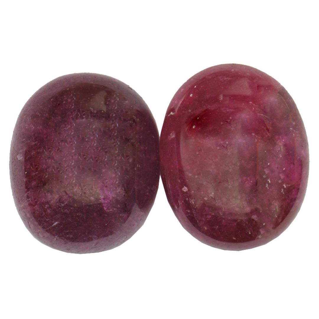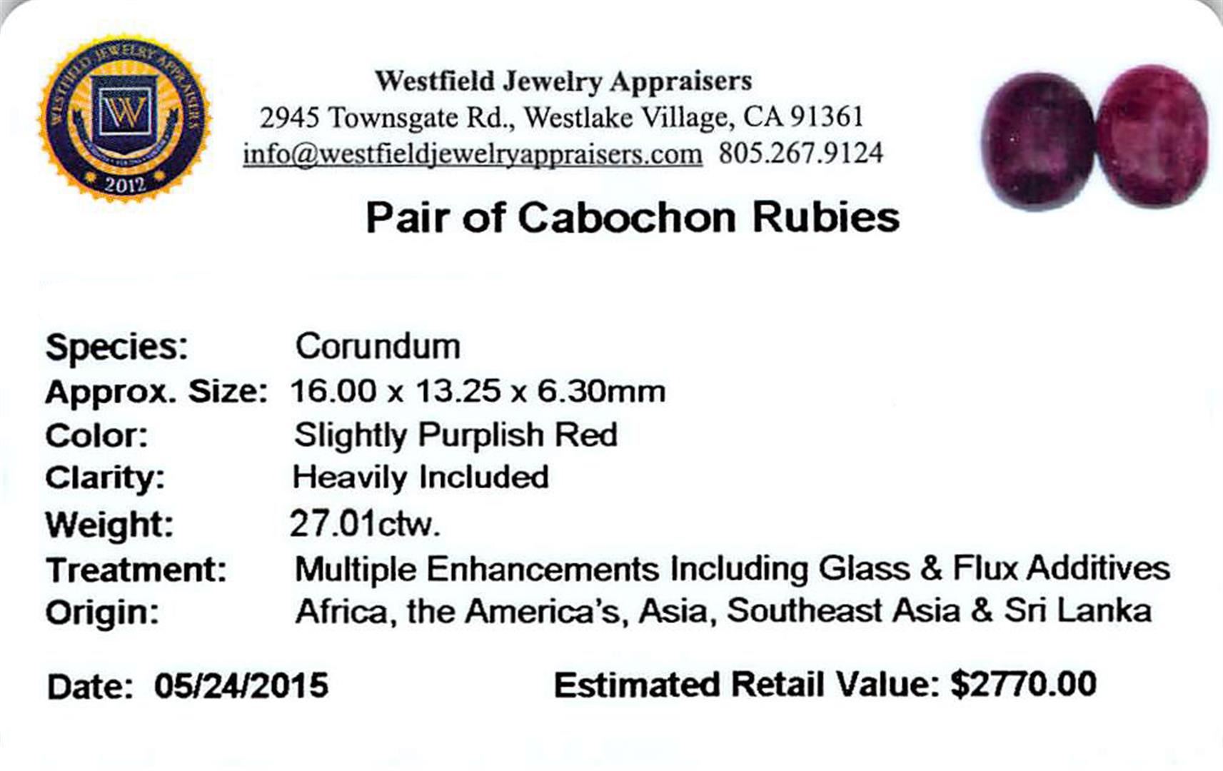 Two oval cabochon cut natural rubies, measuring 16.00 x 13.25 x 6.30mm, exact total weight 27.01ct., clarity is heavily included, type II, dark, very slightly brownish, slightly purplish red color, (GIA slpR 7/3), cut is good. Transmitting light diffusely, opaque. Naturally occurring internal & external characteristics are present. Indications of laboratory high temperature heat treatment, with glass & flux additives. Ruby has a low tolerance to rhodium plating, repolishing the surface, & ultrasonic cleaning._x000D_ Westfield Appraised.