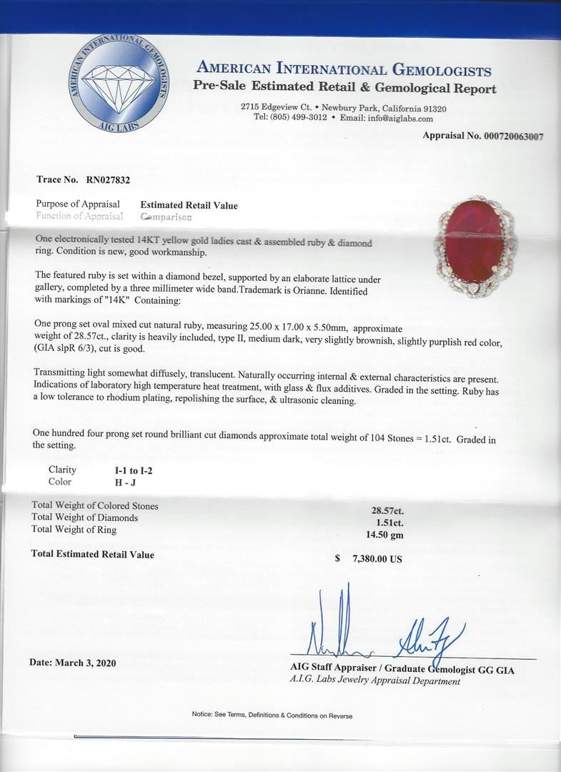 One 28.57ct Ruby and Diamond Ring - 14KT Yellow Gold. AIG certified. See Appraisal for more details. AIG Appraised.