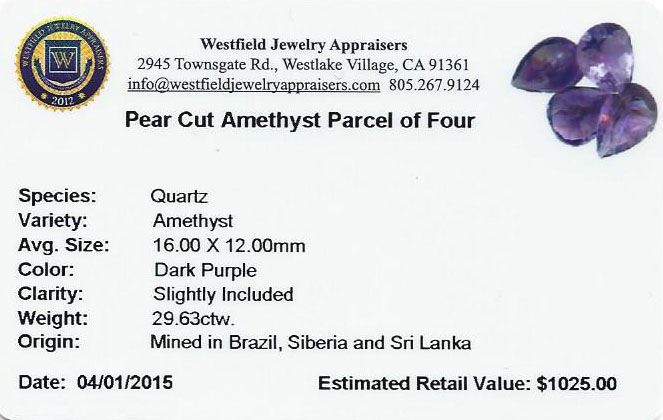 Four pear mixed cut natural amethysts exact total weight 29.52ct., clarity is slightly included, type II, medium dark, very slightly grayish, purple color, (GIA P 6/3), cut is good. Westfield Appraised.