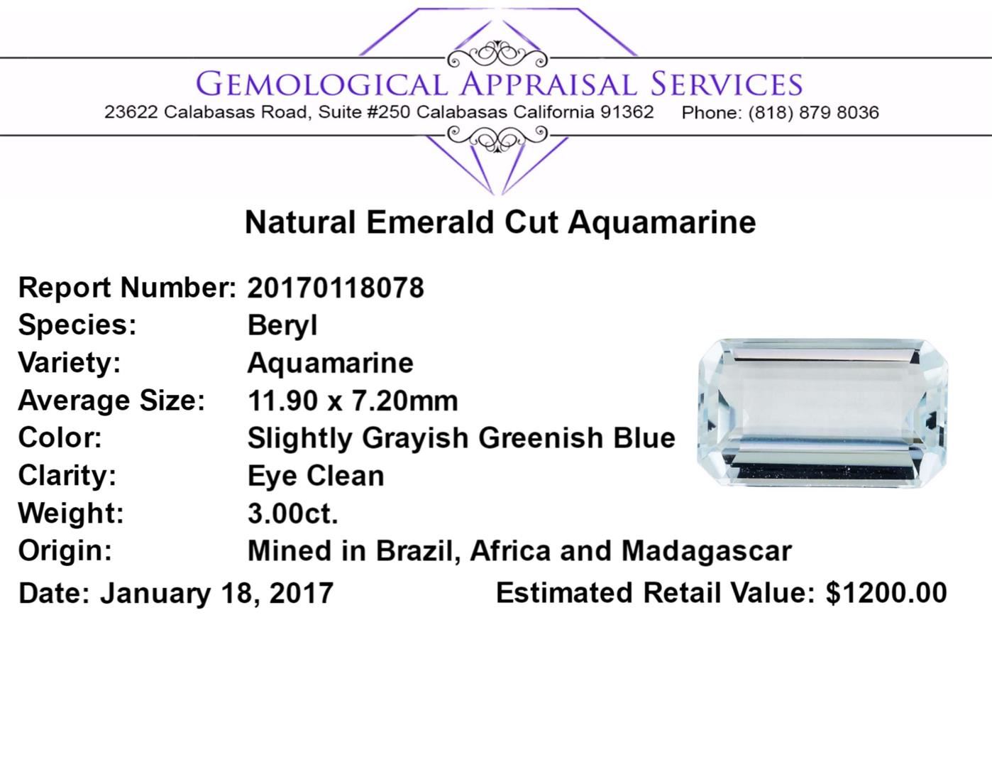 One natural emerald cut aquamarine with an exact weight of 3.00ct., clarity is eye clean, slightly grayish greenish blue. Gemological Appraisals Services estimates the retail value at $1200 GAS Appraised.