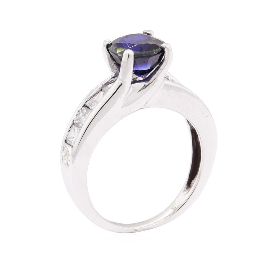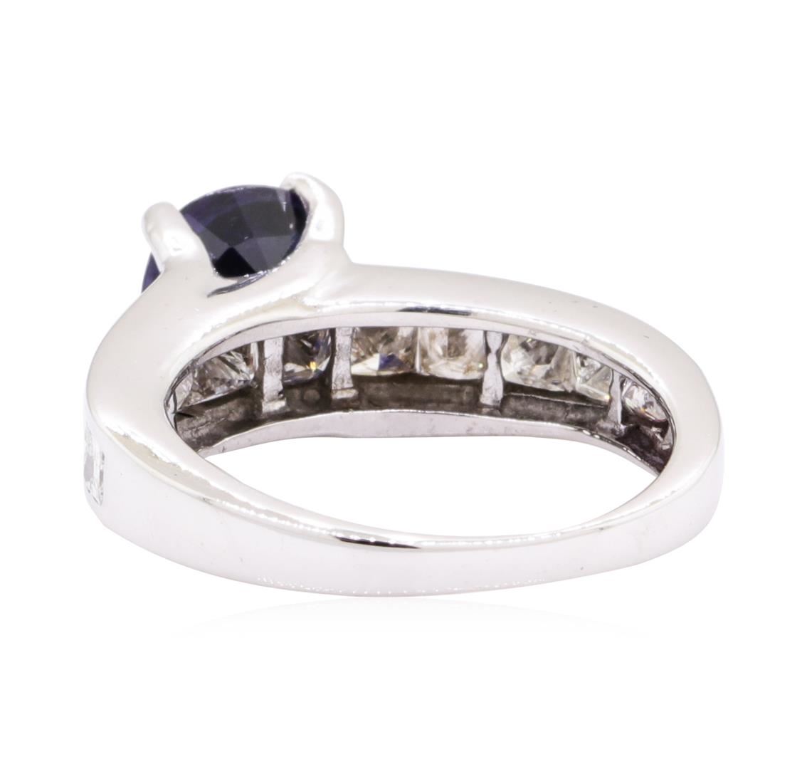 One electronically tested 14KT white gold lady's cast fashion ring with a straight line tapered shank with a bright polish finish. The featured lady's ring has a shank measuring 1.80 millimeters wide. Condition is used, good workmanship. Containing: One prong set doublet cut synthetic blue sapphire, measuring 7.15 x 6.69 x 4.60mm, (depth est.) approximate weight of 2.00ct., clarity is moderately included, medium dark, strong, blue color, (GIA B 6/5), cut is good. The featured sapphire is a doublet. Transmitting light somewhat diffusely, transparent to translucent. Colored gemstones are presumed to have been subjected to commonly used enhancement processes. Graded in the setting. Eleven channel set princess cut diamonds, measuring 2.90 x 2.40 x 1.80mm (depth est.) approximate total weight of 11 Stones = 1.00ct. Graded in the setting. Color H - I Clarity SI-1 to SI-2 Cut Very Good. Total Weight of Colored Stones 2.00ct.. Total Weight of Diamonds 1.00ct.. Total Weight of Ring 3.90gm GAS Appraised at $2390.00. GAS Appraised.