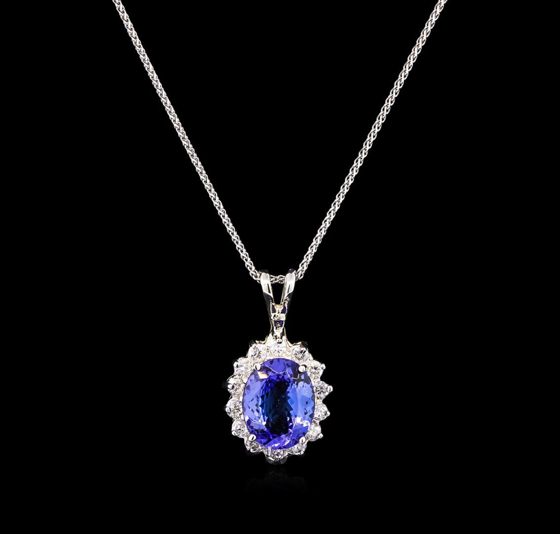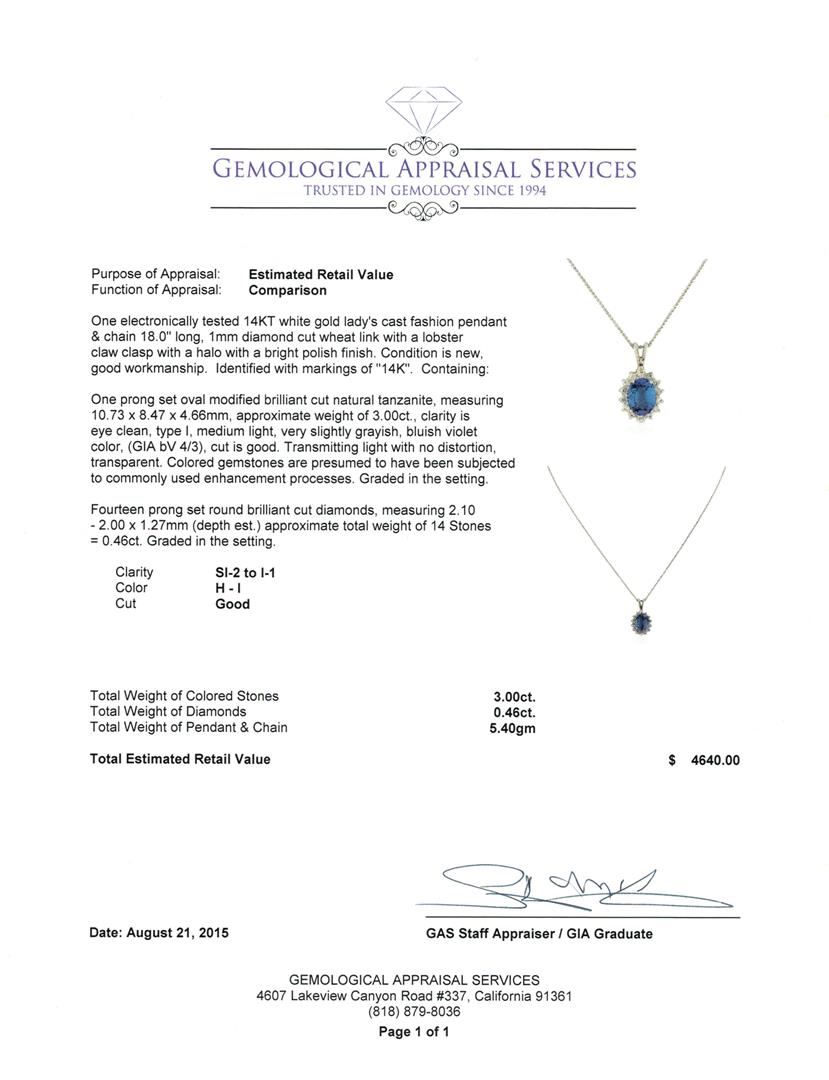 One electronically tested 14KT white gold lady's cast fashion pendant & chain 18.0" long, 1mm diamond cut wheat link with a lobster claw clasp with a halo with a bright polish finish. Identified with markings of "14K". Condition is new, good workmanship. Containing: One prong set oval modified brilliant cut natural tanzanite, measuring 10.73 x 8.47 x 4.66mm, approximate weight of 3.00ct., clarity is eye clean, type I, medium light, very slightly grayish, bluish violet color, (GIA bV 4/3), cut is good. Transmitting light with no distortion, transparent. Colored gemstones are presumed to have been subjected to commonly used enhancement processes. Graded in the setting. Fourteen prong set round brilliant cut diamonds, measuring 2.10 - 2.00 x 1.27mm (depth est.) approximate total weight of 14 Stones = 0.46ct. Graded in the setting. Clarity: SI-2 to I-1. Color: H - I. Cut Good. Total Weight of Colored Stones 3.00ct. Total Weight of Diamonds 0.46ct. Total Weight of Pendant & Chain 5.40gm.