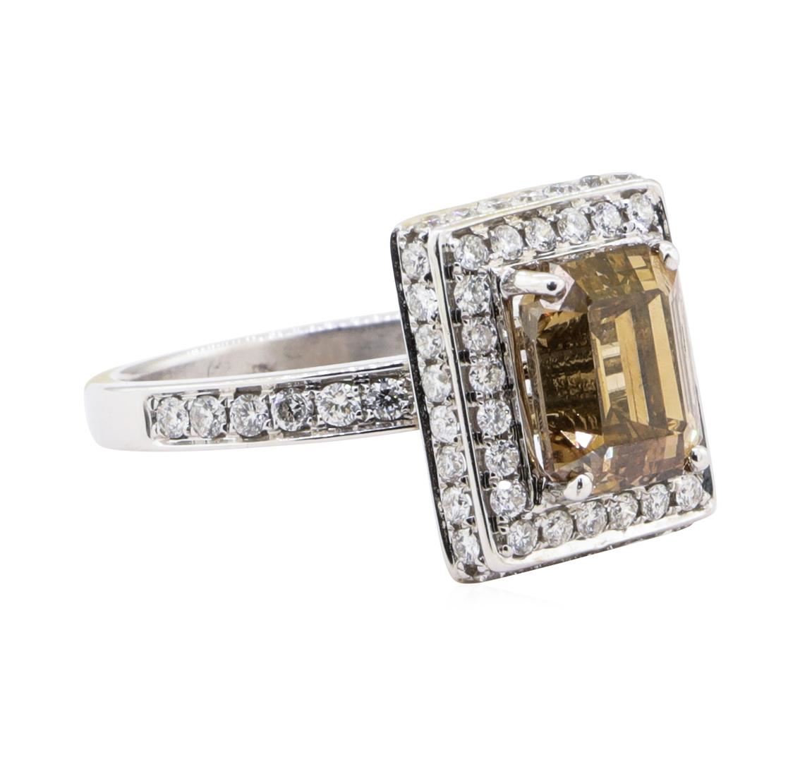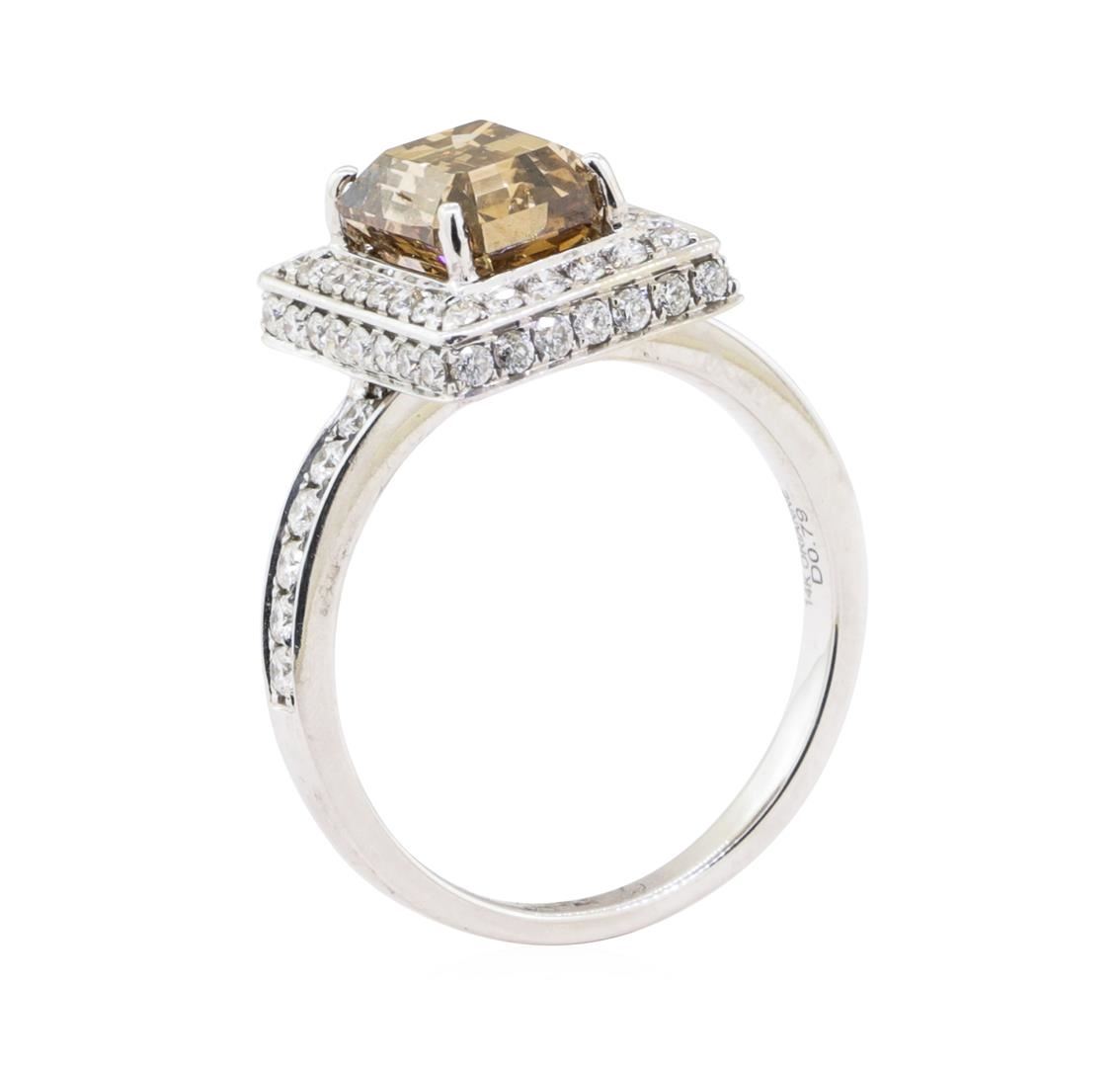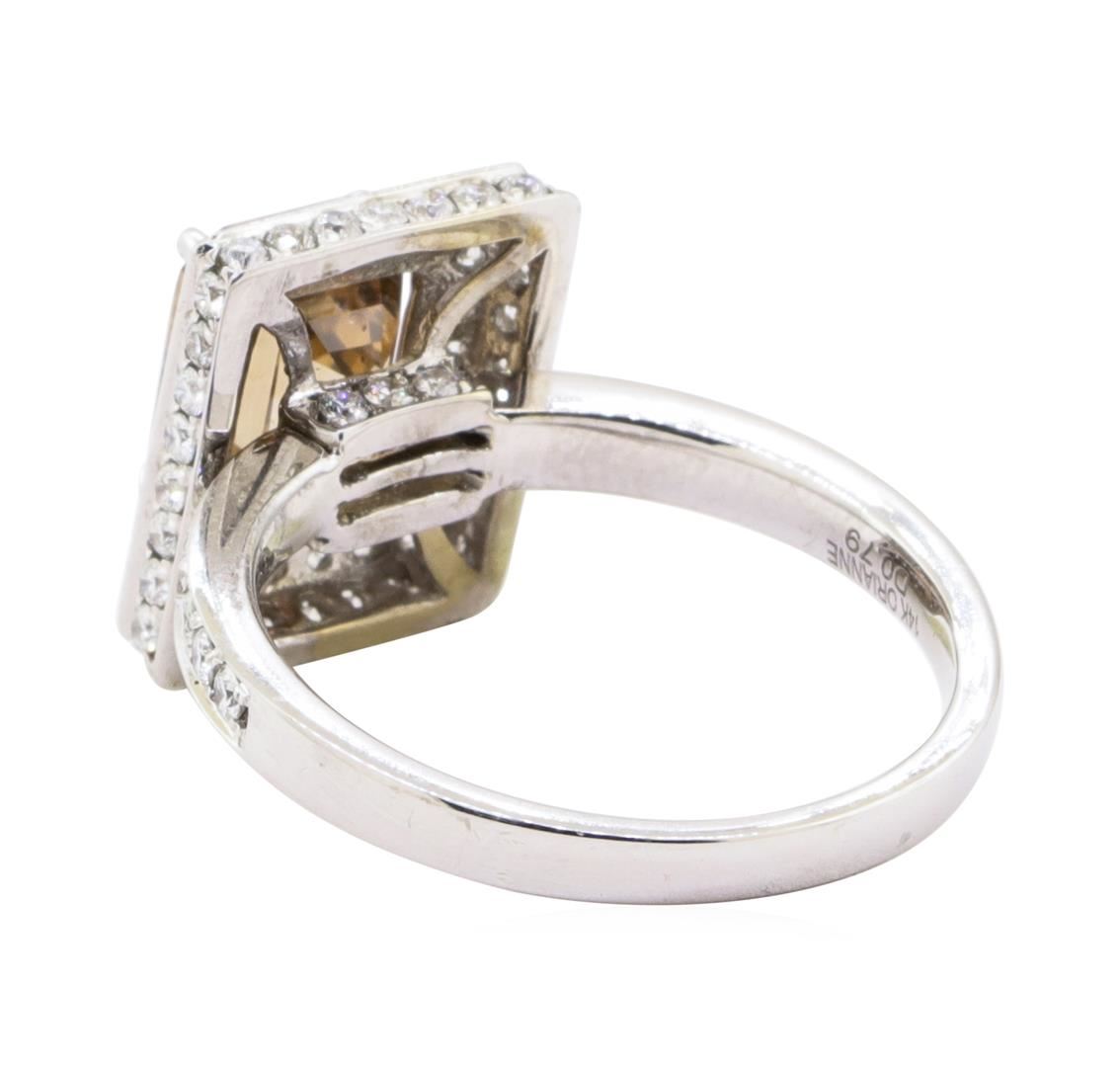 One electronically tested 14KT white gold ladies cast diamond ring. The featured diamond is set within a diamond bezel, supported by diamond set shoulders and completed by a two millimeter wide band. Trademark is ORIANNE. Identified with markings of "14K". Condition is new, good workmanship. Containing: One emerald shaped cut diamond, measuring 8.47 x 6.63 x 5.58mm exact weight 3.01ct with a faint blue fluorescence. Graded loose prior to setting in the EGL Laboratory, Report # US 904043617D. Clarity SI-1 Depth 84.2% Table 55.0% Pavil. Depth% 56.9% Seventy-Four bead set round brilliant cut diamonds, measuring 1.50 - 1.30 x 0.84mm (depth est.) approximate total weight of 74 Stones = 0.79ct. Graded in the setting. Clarity SI-2 to I-1 Color F - H Total Weight of Diamonds 3.80 ct. Estimated Retail Value $ 62,100.00 US