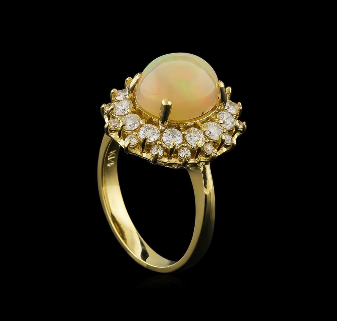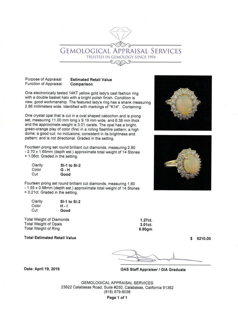 One electronically tested 14KT yellow gold lady's cast fashion ring with a double basket halo with a bright polish finish. The featured lady's ring has a shank measuring 2.86 millimeters wide. Identified with markings of "K14". Condition is new, good workmanship. Containing: One crystal opal that is cut in a oval shaped cabochon and is prong set, measuring 11.00 mm long x 9.19 mm wide, and 6.38 mm thick and the approximate weight is 3.01 carats. The opal has a bright, green-orange play of color (fire) in a rolling flashfire pattern; a high dome; a good cut; no inclusions; consistent in its brightness and pattern; and is not directional. Graded in the setting. Fourteen prong set round brilliant cut diamonds, measuring 2.80 - 2.70 x 1.65mm (depth est.) approximate total weight of 14 Stones = 1.06ct. Graded in the setting. Clarity: SI-1 to SI-2. Color: G - Good Fourteen prong set round brilliant cut diamonds, measuring 1.60 - 1.55 x 0.98mm (depth est.) approximate total weight of 14 Stones = 0.21ct. Graded in the setting. Clarity: SI-1 to SI-2. Color: H - I. Cut Good. Total Weight of Diamonds 1.27ct. Total Weight of Opals 3.01ct. Total Weight of Ring 6.80gm. GAS Appraised.