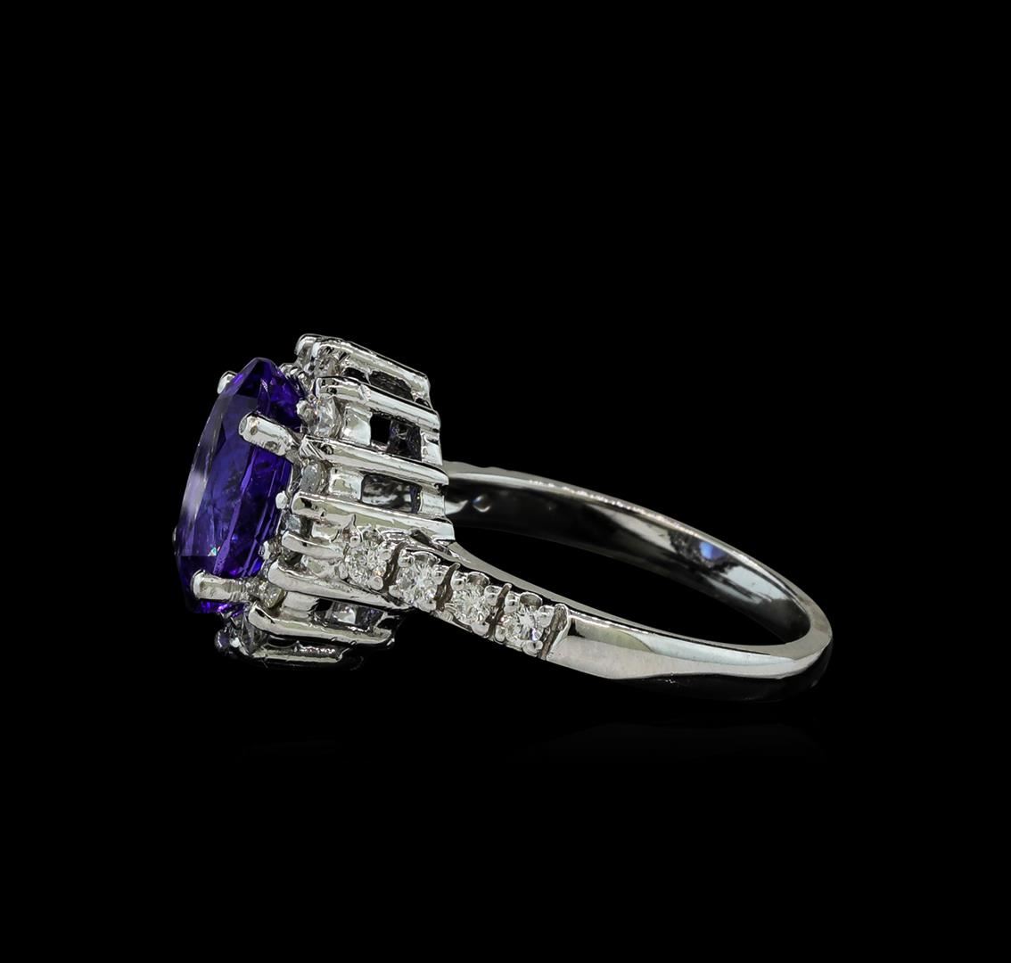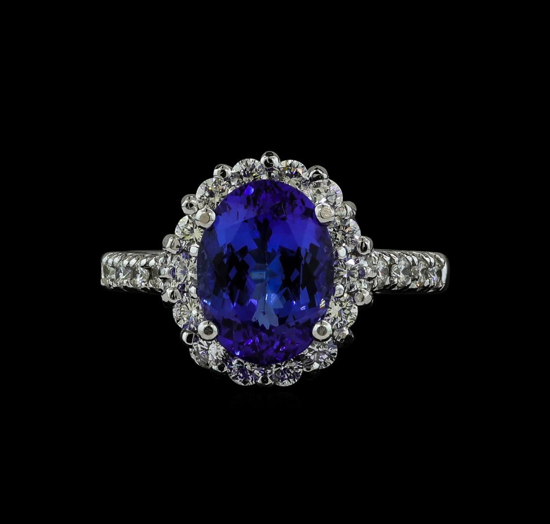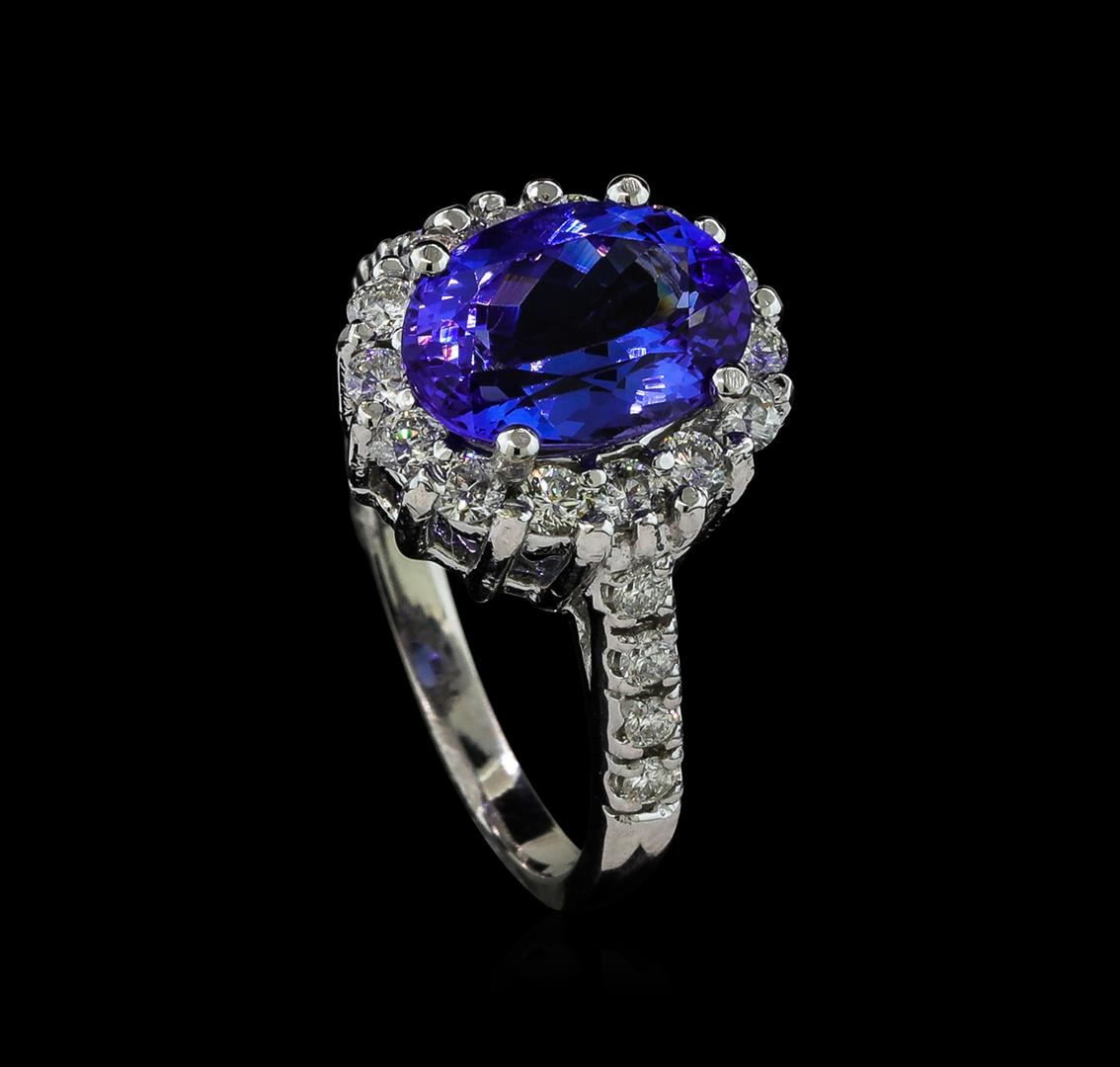One electronically tested 14KT white gold lady's cast fashion ring with a basket halo with a bright polish finish. The featured lady's ring has a shank measuring 2.05 millimeters wide. Identified with markings of '14K'. Condition is new, good workmanship. Containing: One prong set oval modified brilliant cut natural tanzanite, measuring 10.48 x 7.76 x 5.07mm, (depth est.) 5%. bulge factor, approximate weight of 3.01ct., clarity is eye clean, medium dark, moderately strong, violetish blue color, (GIA vB 6/4), cut is very good. Transmitting light with no distortion, transparent. Colored gemstones are presumed to have been subjected to commonly used enhancement processes. Graded in the setting. Eight prong set round brilliant cut diamonds, measuring 1.80 - 1.70 x 1.09mm (depth est.) approximate total weight of 8 Stones = 0.16ct. Graded in the setting. Clarity SI-1 to I-1. Color: H - I Cut Good Fourteen prong set round brilliant cut diamonds, measuring 2.30 - 2.20 x 1.35mm (depth est.) approximate total weight of 14 Stones = 0.58ct. Graded in the setting. Clarity SI-1 to I-1. Color: H - I Cut Good. Total Weight of Colored Stones 3.01ct.. Total Weight of Diamonds 0.74ct.. Total Weight of Ring 5.40gm GAS Appraised at $7,695.00.