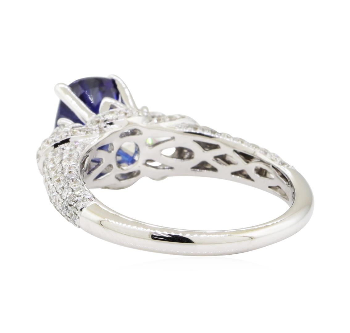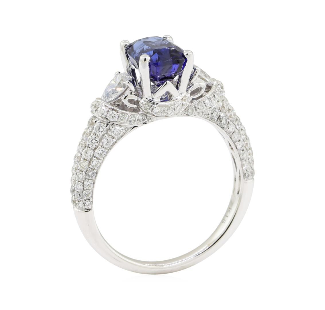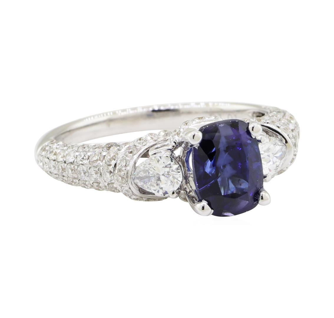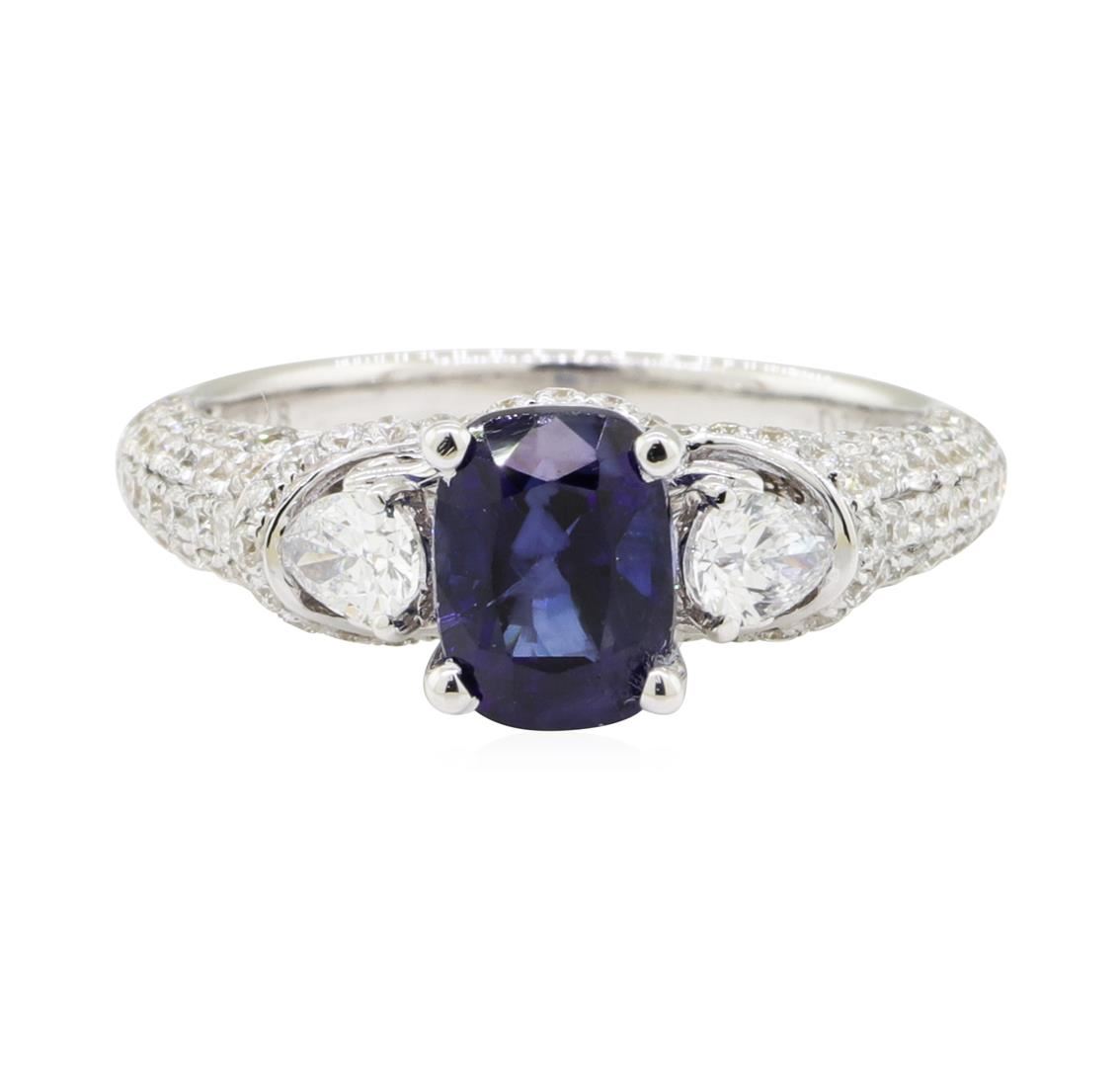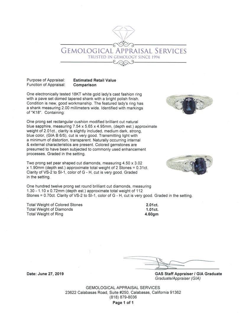 One electronically tested 18KT white gold lady's cast fashion ring with a pave set domed tapered shank with a bright polish finish. The featured lady's ring has a shank measuring 2.00 millimeters wide. Identified with markings of 'K18'. Condition is new, good workmanship. Containing: One prong set rectangular cushion modified brilliant cut natural blue sapphire, measuring 7.54 x 5.65 x 4.95mm, (depth est.) approximate weight of 2.01ct., clarity is slightly included, medium dark, strong, blue color, (GIA B 6/5), cut is very good. Transmitting light with a minimum of distortion, transparent. Naturally occurring internal & external characteristics are present. Colored gemstones are presumed to have been subjected to commonly used enhancement processes. Graded in the setting. Two prong set pear shaped cut diamonds, measuring 4.50 x 3.02 x 1.90mm (depth est.) approximate total weight of 2 Stones = 0.31ct. Graded in the setting. Color G - H Clarity VS-2 to SI-1 Cut Very Good One Hundred Twelve prong set round brilliant cut diamonds, measuring 1.30 - 1.10 x 0.72mm (depth est.) approximate total weight of 112 Stones = 0.70ct. Graded in the setting. Color G - H Clarity VS-2 to SI-1 Cut Very Good. Total Weight of Colored Stones 2.01ct.. Total Weight of Diamonds 1.01ct.. Total Weight of Ring 4.60gm GAS Appraised at $7945.00. GAS Appraised.
