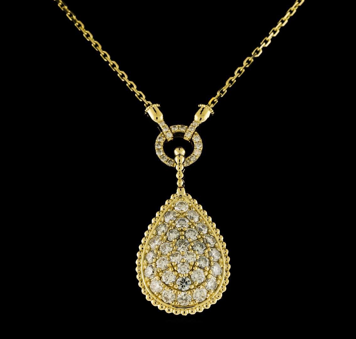 One electronically tested 14KT yellow gold lady's combination cast & assembled fashion necklace with a lobster claw clasp with a bright polish finish. The featured lady's necklace has a 16 inch long 1.5mm diamond cut cable link chain with a drop of 41 millimeters. Identified with markings of 'K14'. Condition is new, good workmanship. Containing: Thirty prong set round brilliant cut diamonds, measuring 3.00 - 2.90 x 1.77mm (depth est.) approximate total weight of 30 Stones = 2.80ct. Graded in the setting. Clarity SI-1 to I-1. Color: G - I Cut Good Eighteen prong set round brilliant cut diamonds, measuring 1.50 - 1.45 x 0.92mm (depth est.) approximate total weight of 18 Stones = 0.22ct. Graded in the setting. Clarity SI-1 to SI-2. Color: H - I Cut Good. Total Weight of Diamonds 3.02ct.. Total Weight of Necklace 12.10gm. GAS Appraised.