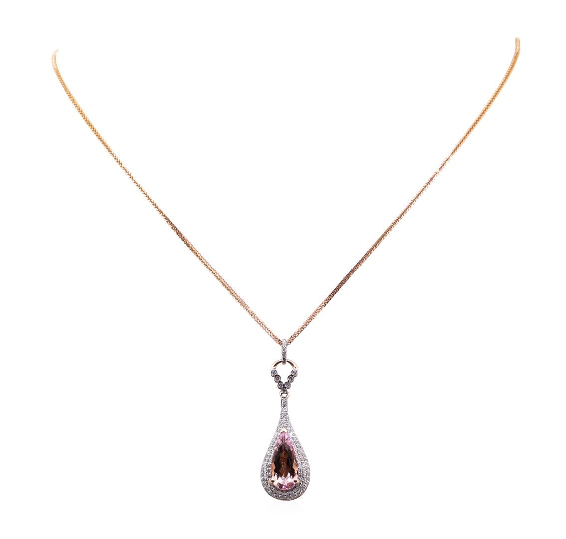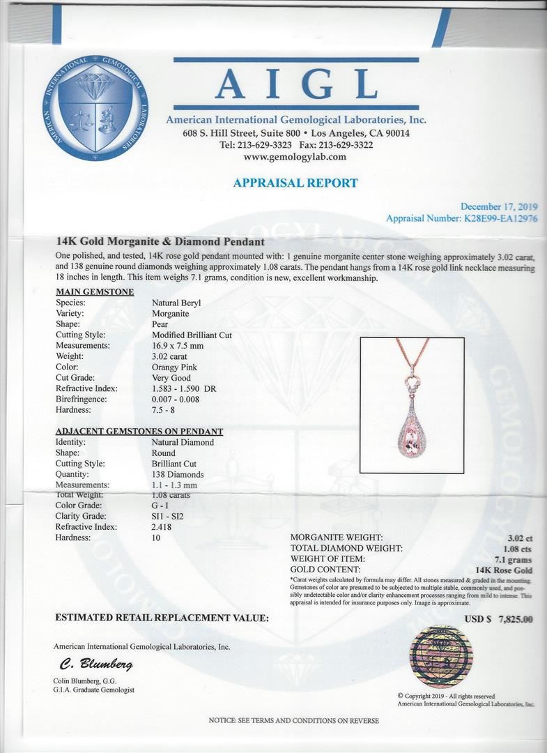 One 3.02ct Morganite and Diamond Pendant With Chain - 14KT Rose Gold. AIG certified. See Appraisal for more details. AIG Appraised.