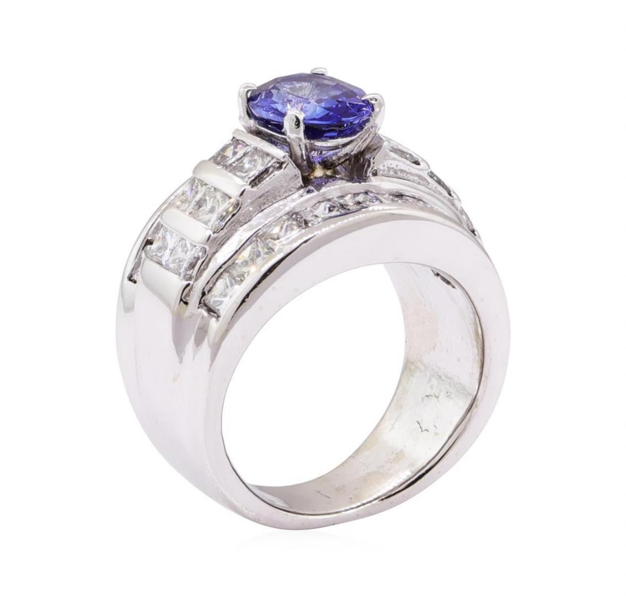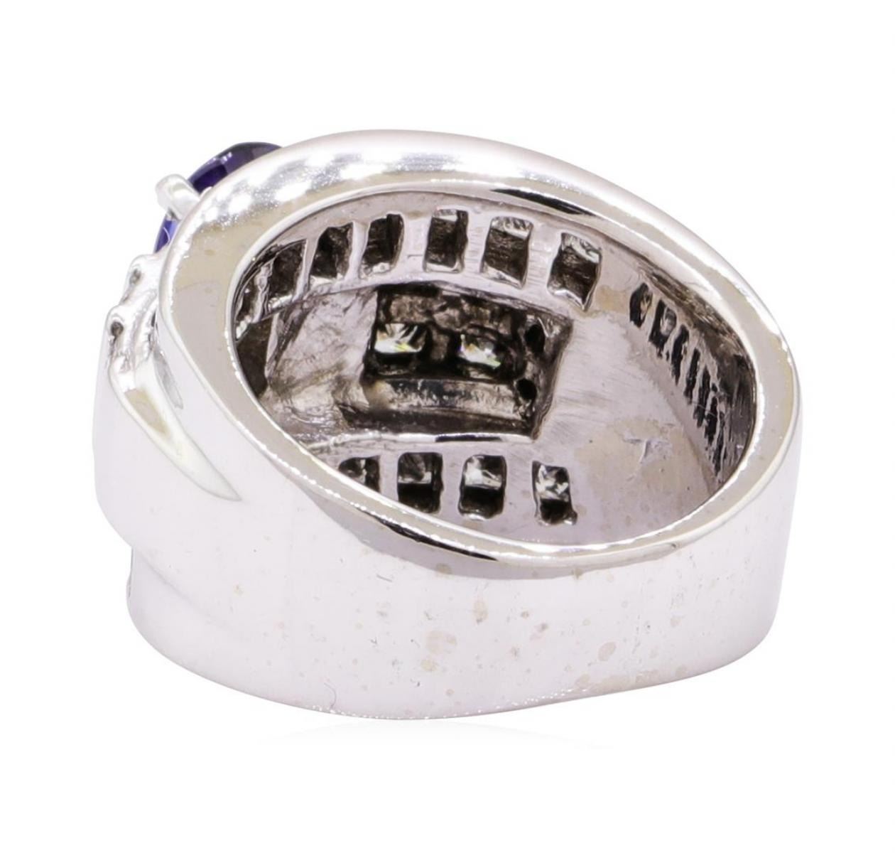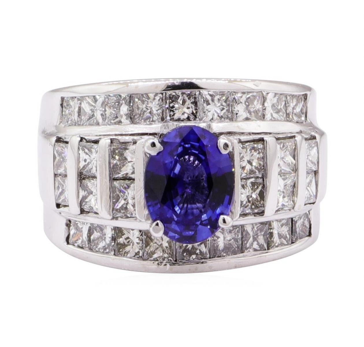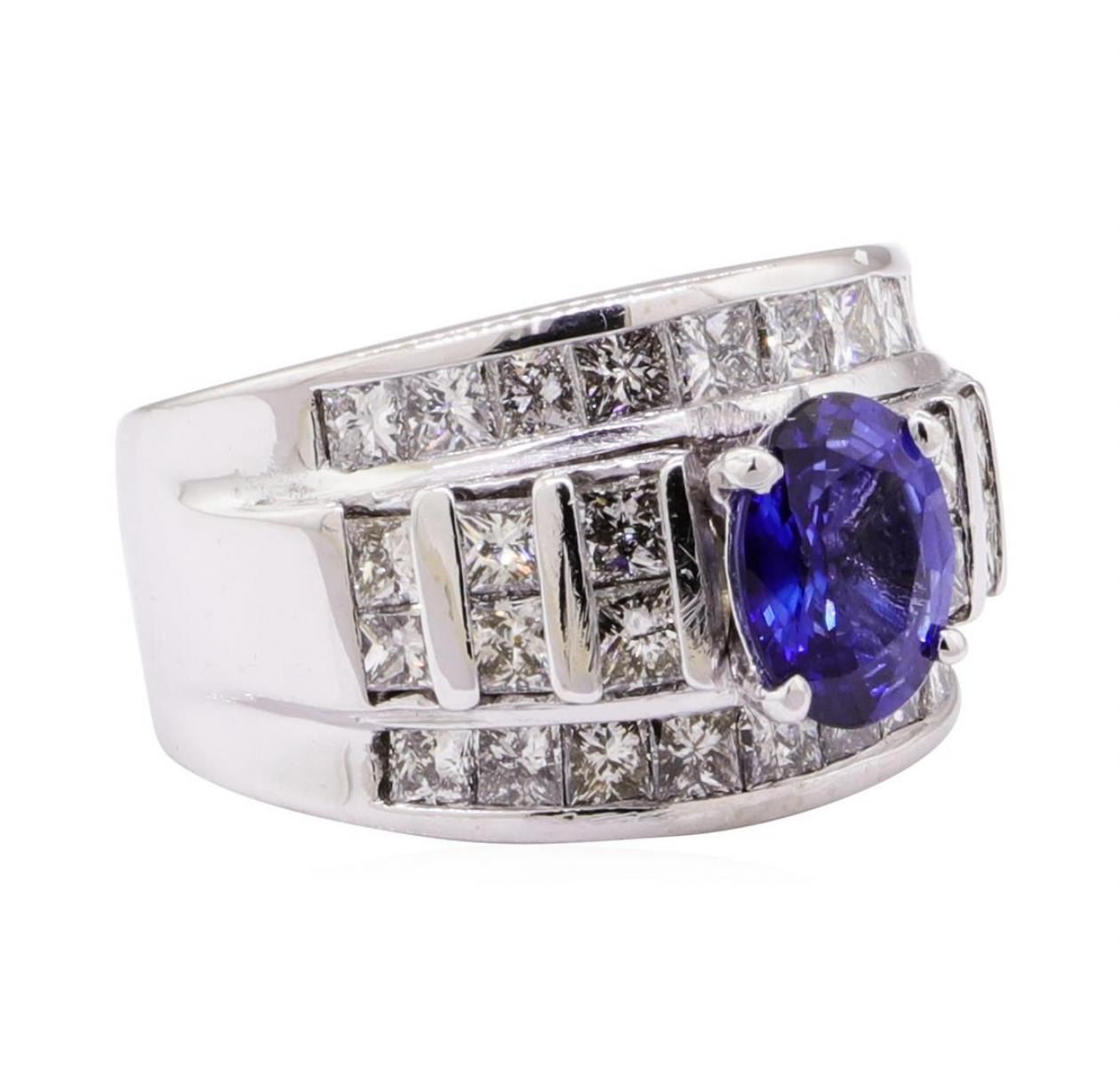 One electronically tested 14KT white gold lady's cast fashion ring with a tapered wide band with a bright polish finish. The featured lady's ring has a shank measuring 5.20 millimeters wide. Identified with markings of '14K'. Condition is new, good workmanship. Containing: One prong set oval modified mixed cut natural blue sapphire, measuring 7.93 x 6.07 x 3.30mm, (depth est.) approximate weight of 1.32ct., clarity is eye clean, medium, moderately strong, blue color, (GIA B 5/4), cut is very good. Transmitting light with no distortion, transparent. Colored gemstones are presumed to have been subjected to commonly used enhancement processes. Graded in the setting. Thirty channel set princess cut diamonds, measuring 2.30 x 2.00 x 1.50mm (depth est.) approximate total weight of 30 Stones = 1.70ct. Graded in the setting. Color H - J Clarity VS-2 to SI-1 Cut Very Good. Total Weight of Colored Stones 1.32ct.. Total Weight of Diamonds 1.70ct.. Total Weight of Ring 12.40gm GAS Appraised at $7875.00. GAS Appraised.