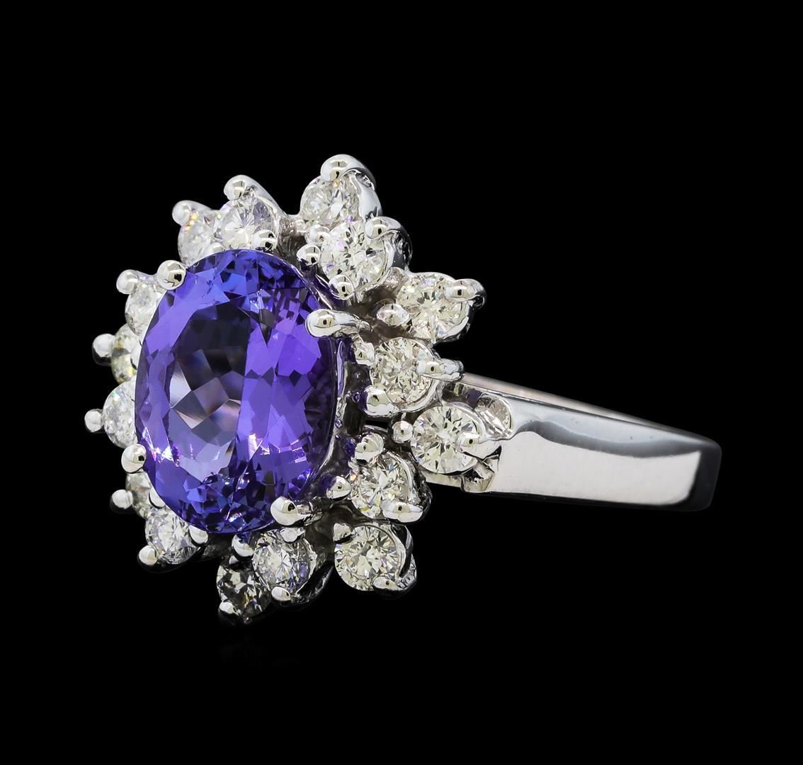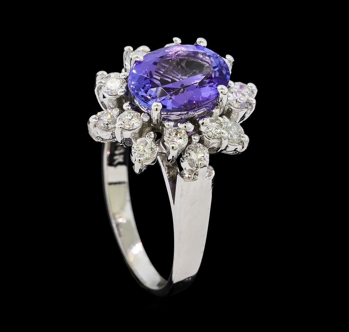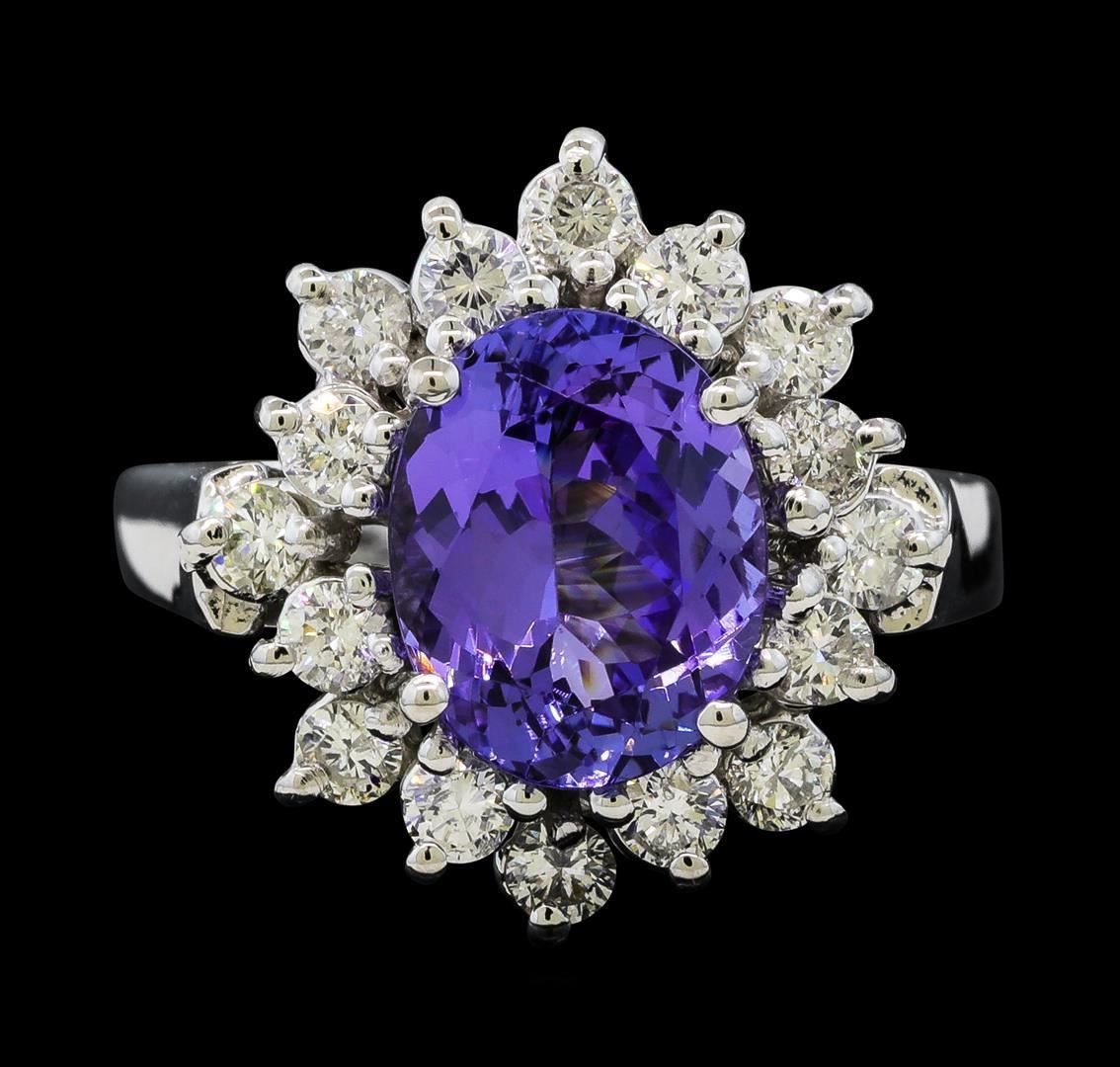 One electronically tested 14KT white gold lady's cast fashion ring with a staggered basket halo with a bright polish finish. The featured lady's ring has a shank measuring 2.14 millimeters wide. Identified with markings of '14K'. Condition is new, good workmanship. Containing: One prong set oval modified brilliant cut natural tanzanite, measuring 9.44 x 7.45 x 4.61mm, (depth est.) approximate weight of 2.37ct., clarity is eye clean, medium, moderately strong, violetish blue color, (GIA vB 5/4), cut is very good. Transmitting light with no distortion, transparent. Colored gemstones are presumed to have been subjected to commonly used enhancement processes. Graded in the setting. Sixteen prong set round brilliant cut diamonds, measuring 2.25 - 2.15 x 1.36mm (depth est.) approximate total weight of 16 Stones = 0.65ct. Graded in the setting. Clarity SI-1 to I-1. Color: G - H Cut Good. Total Weight of Colored Stones 2.37ct.. Total Weight of Diamonds 0.65ct.. Total Weight of Ring 5.20gm.