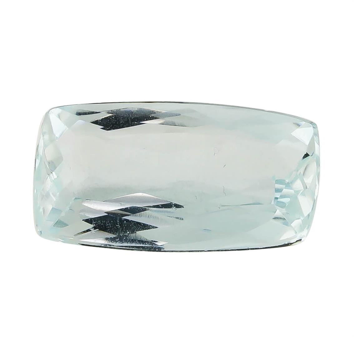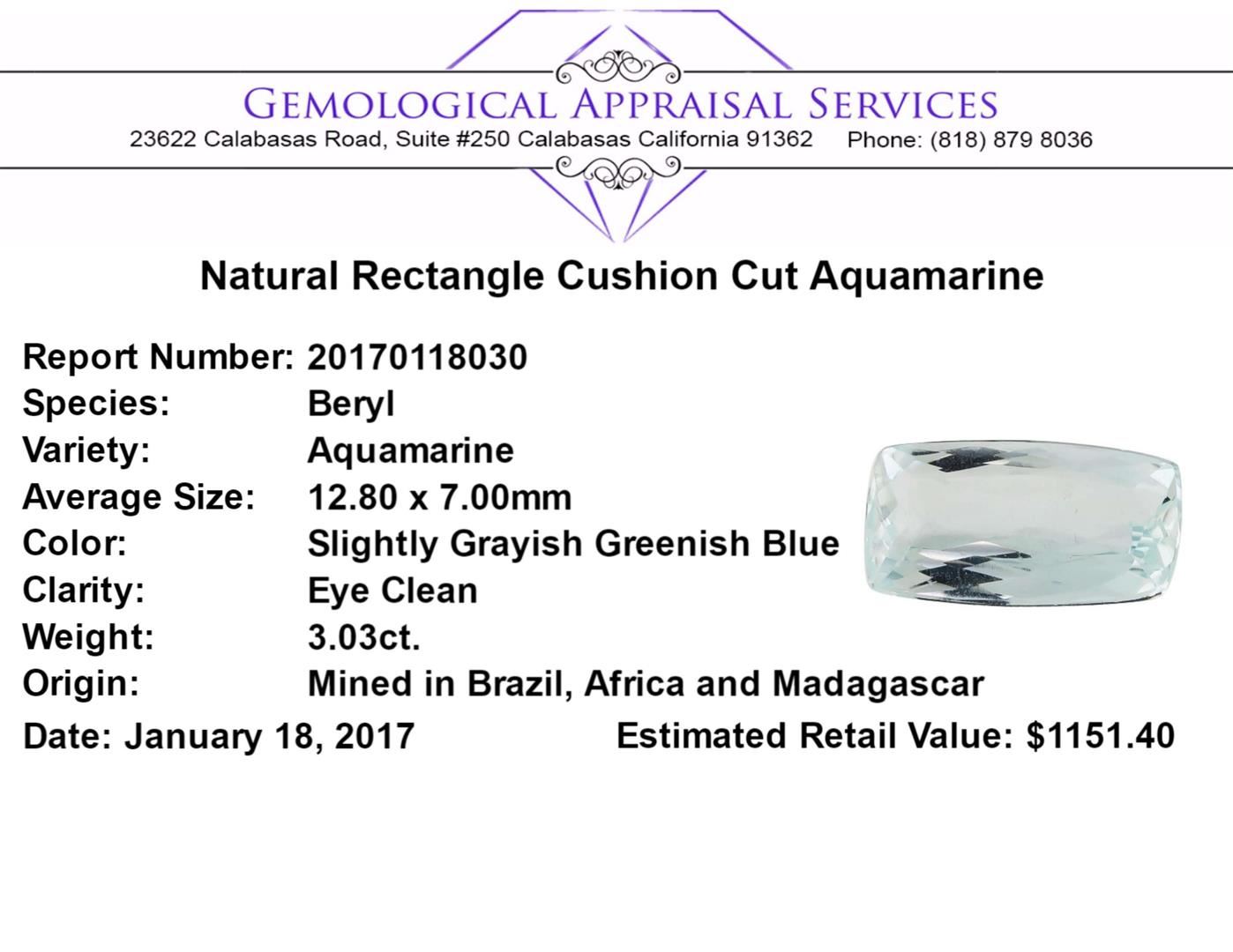 One natural rectangle cushion cut aquamarine with an exact weight of 3.03ct., clarity is eye clean, slightly grayish greenish blue. Gemological Appraisals Services estimates the retail value at $1151.4 GAS Appraised.
