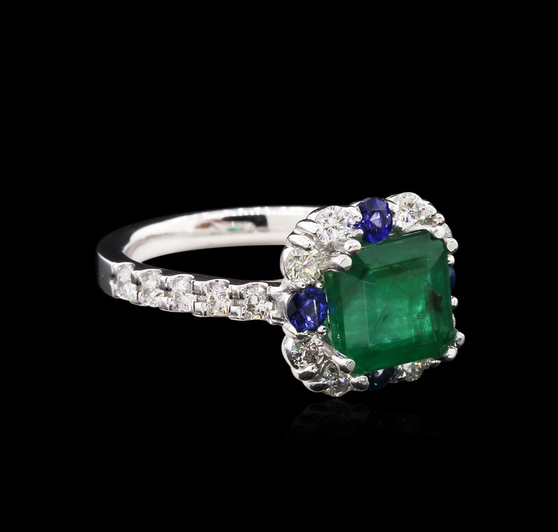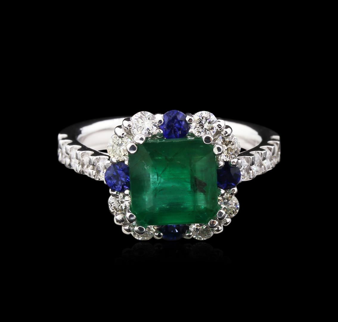 One electronically tested 14KT white gold lady's cast fashion ring with a halo with a bright polish finish. The featured ring has a shank measuring 2.40 millimeters in width. Identified with markings of "14K". Condition is new, good workmanship. Containing: One prong set square emerald step cut natural emerald, measuring 8.10 x 8.01 x 5.73mm, 20% bulge factor, approximate weight of 3.03ct., clarity is moderately included, type III, medium dark, moderately strong, green color, (GIA G 6/4), cut is good. Transmitting light somewhat diffusely, semi-transparent to translucent. Naturally occurring internal & external characteristics are present. Indications of oil residue. Graded in the setting. Four prong set round modified brilliant cut natural blue sapphires, measuring 2.70 - 2.60 x 1.73 mm, approximate total weight of 0.40ct., clarity is slightly included, type II, medium dark, moderately strong, violetish blue color, (GIA vB 6/4), cut is good. Transmitting light somewhat diffusely, transparent to translucent. Colored gemstones are presumed to have been subjected to commonly used enhancement processes. Graded in the setting. Eight prong set round brilliant cut diamonds, measuring 2.50 - 2.45 x 1.54mm (depth est.) approximate total weight of 8 Stones = 0.46ct. Graded in the setting. Clarity: SI-1 to SI-2. Color: H - I. Cut Good Ten split prong set round brilliant cut diamonds, measuring 2.10 - 2.00 x 1.23mm (depth est.) approximate total weight of 10 Stones = 0.32ct. Graded in the setting. Clarity: SI-1 to SI-2. Color: H - I. Cut Good. Total Weight of Colored Stones 3.43ct. Total Weight of Diamonds 0.78ct. Total Weight of Ring 5.90gm. GAS Appraised at $6,760.00.