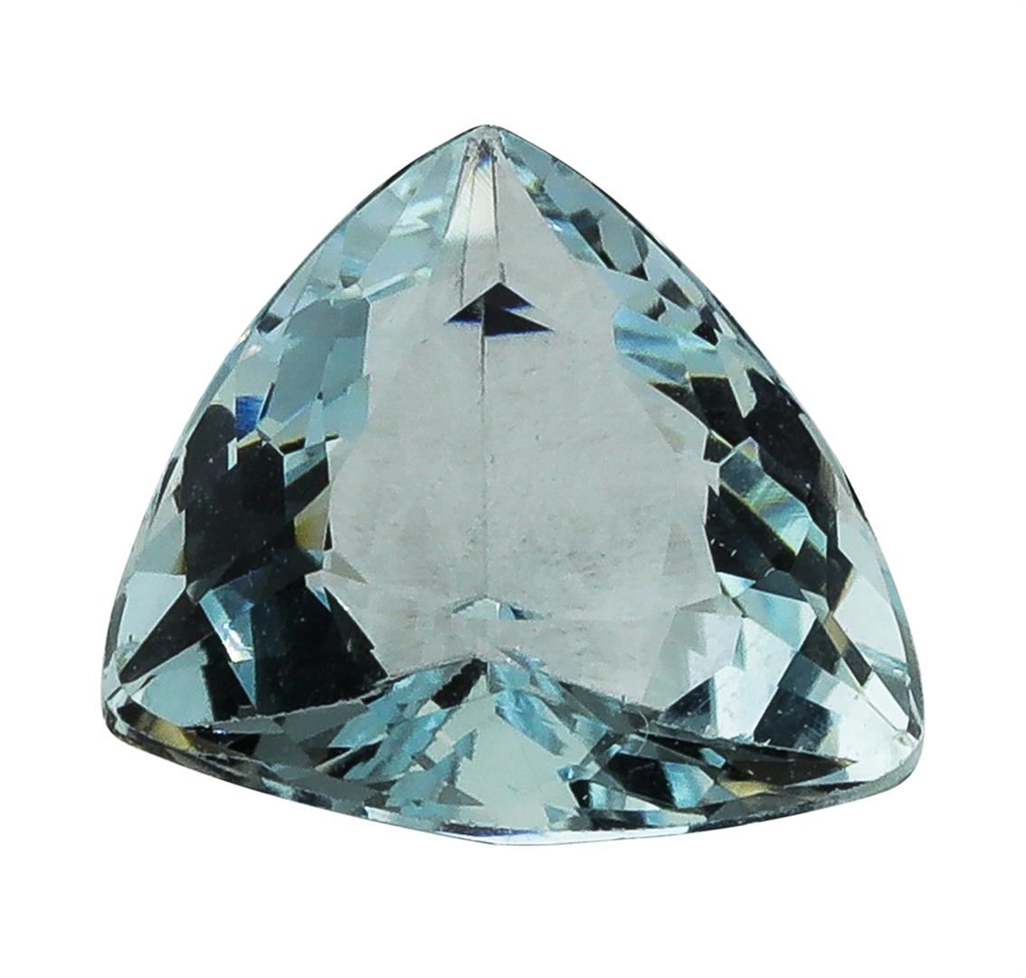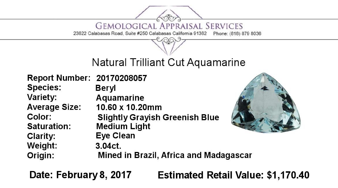 One natural trilliant cut aquamarine with an exact weight of 3.04ct., clarity is eye clean, slightly grayish greenish blue, medium light. Gemological Appraisals Services estimates the retail value at $1170.4 GAS Appraised.