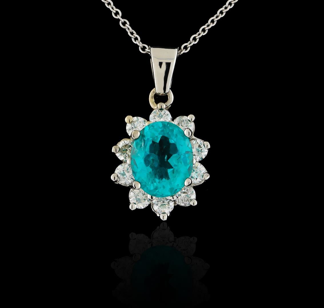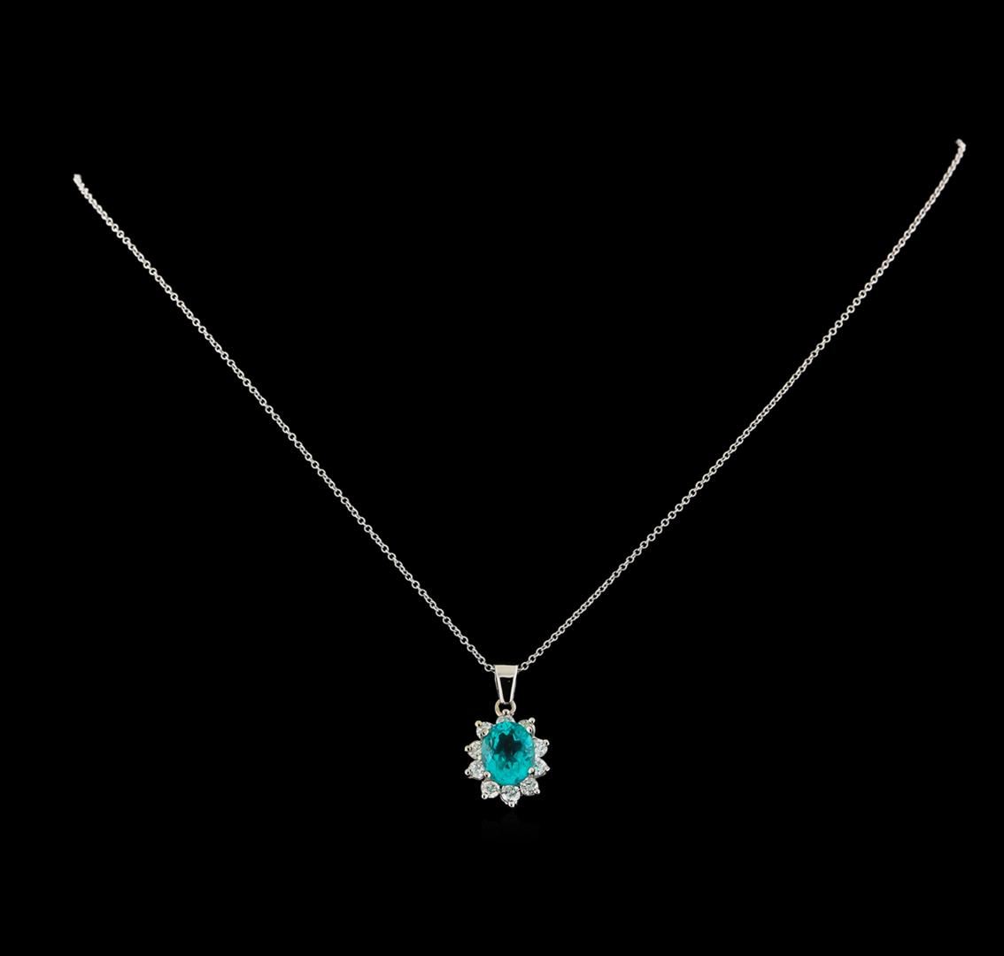 One electronically tested 14KT white gold ladies cast & assembled apatite and diamond pendant with chain. The pendant features an apatite set within a diamond floret bezel, completed by a white gold bail. The pendant is supported by an eighteen inch length 14KT white gold designer style chain, terminating in a spring ring clasp. Bright polish finish. Identified with markings of "14K". Condition is new, good workmanship. Containing: One prong set oval mixed cut natural apatite, measuring 9.75 x 8.00 x 5.45mm, 6%. bulge factor, exact weight 3.04ct., clarity is slightly included, medium dark, moderately strong, very strongly bluish green color, (GIA vstbG 6/4), cut is good. Transmitting light with a minimum of distortion, transparent. Naturally occurring internal & external characteristics are present. Graded in the setting. Ten prong set round brilliant cut diamonds, measuring 2.90 - 2.80 x 1.71mm exact total weight 10 Stones = 0.90ct. Graded in the setting. Clarity: SI-2 to I-1. Color: G - I. Total Weight of Colored Stones 3.04ct. Total Weight of Diamonds 0.90ct. Total Weight of Pendant With Chain 5.00gm. AIG Appraised.