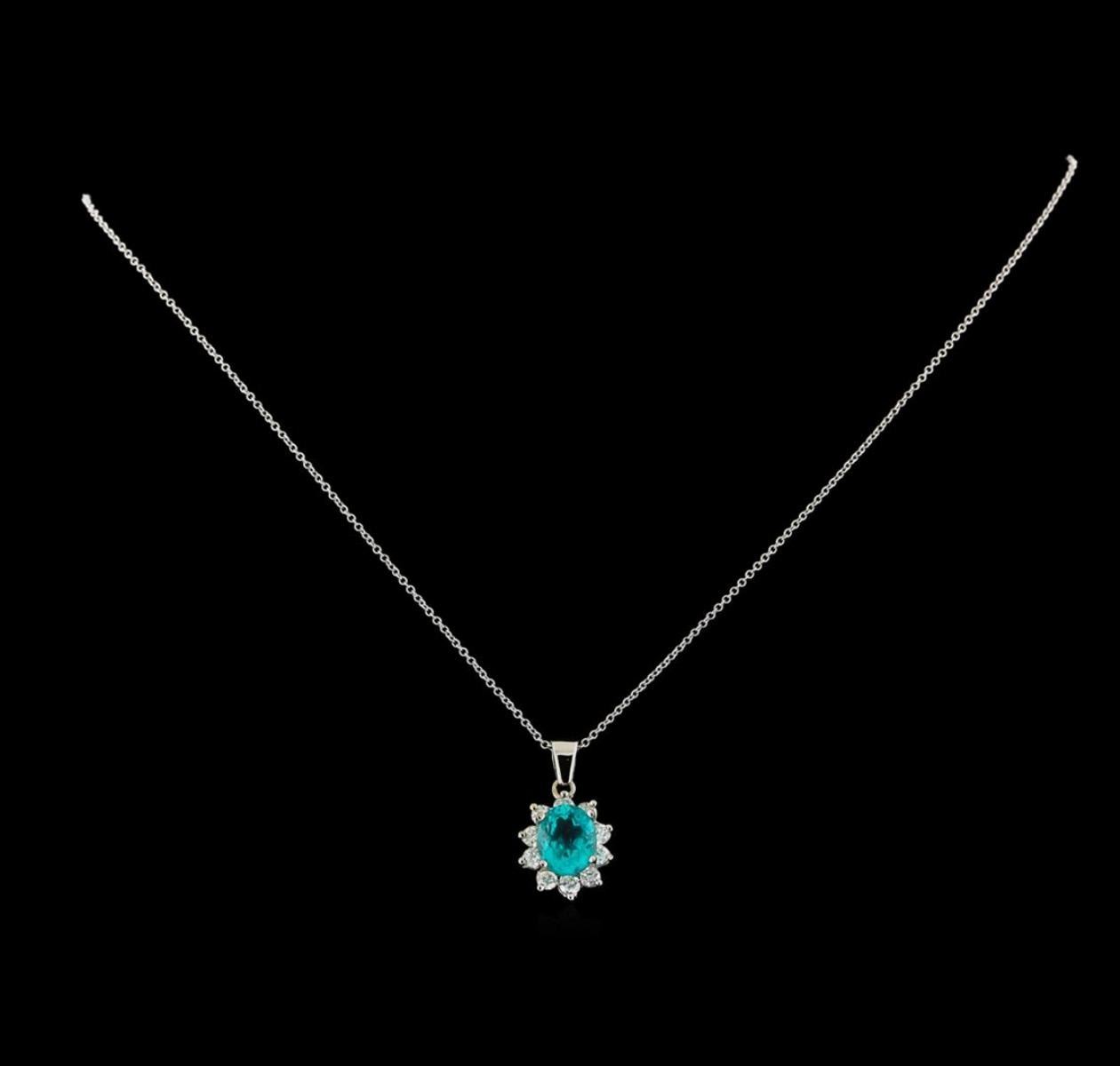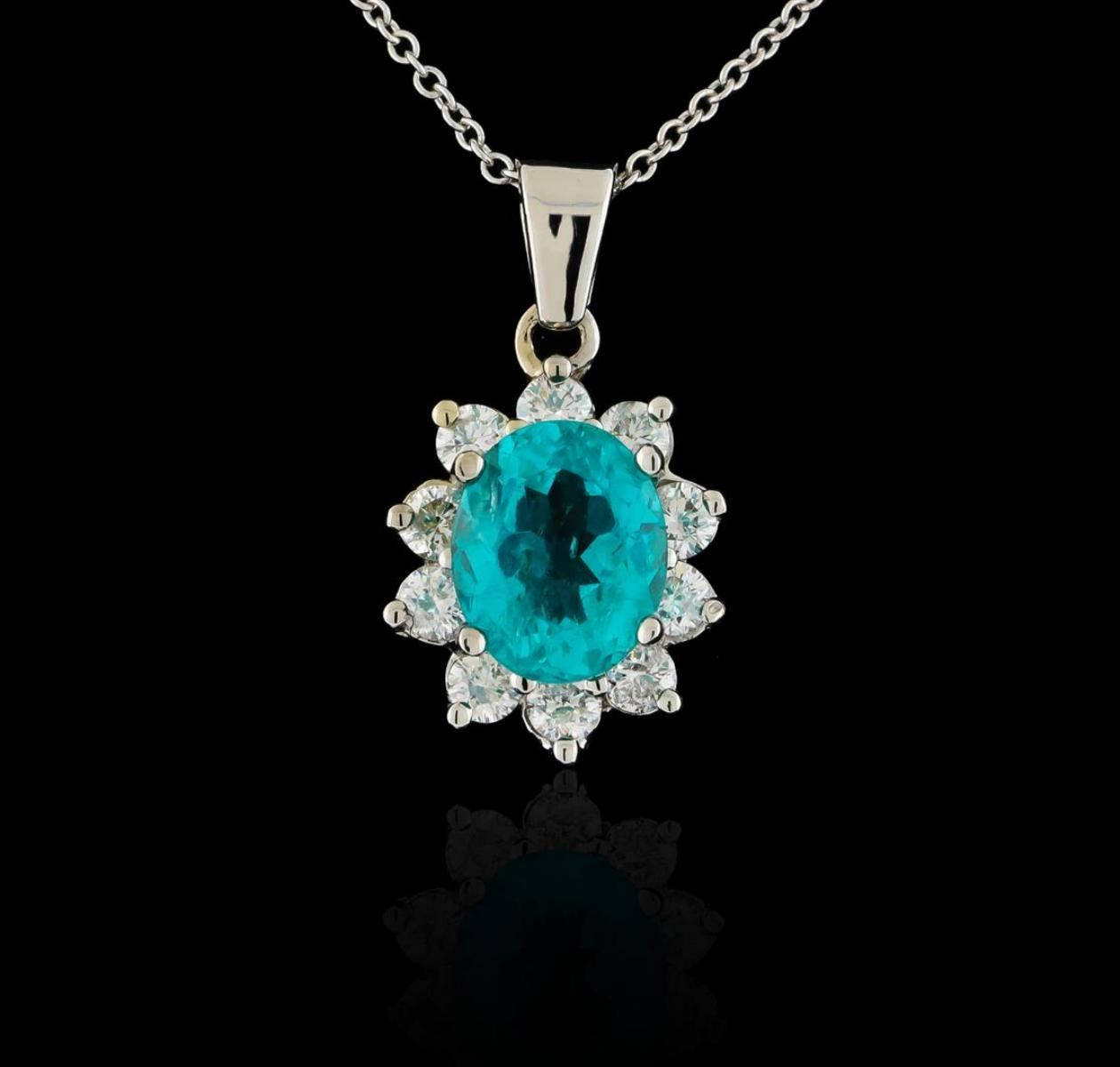 One electronically tested 14KT white gold ladies cast & assembled apatite and diamond pendant with chain. The pendant features an apatite set within a diamond floret bezel, completed by a white gold bail. The pendant is supported by an eighteen inch length 14KT white gold designer style chain, terminating in a spring ring clasp. Bright polish finish. Identified with markings of "14K". Condition is new, good workmanship. Containing: One prong set oval mixed cut natural apatite, measuring 9.75 x 8.00 x 5.45mm, 6%. bulge factor, exact weight 3.04ct., clarity is slightly included, medium dark, moderately strong, very strongly bluish green color, (GIA vstbG 6/4), cut is good. Transmitting light with a minimum of distortion, transparent. Naturally occurring internal & external characteristics are present. Graded in the setting. Ten prong set round brilliant cut diamonds, measuring 2.90 - 2.80 x 1.71mm exact total weight 10 Stones = 0.90 ct. Graded in the setting. Clarity: SI-2 to I-1. Color: G - I. Total Weight of Colored Stones 3.04ct. Total Weight of Diamonds 0.90 ct. Total Weight of Pendant With Chain 5.00gm. AIG Appraised.