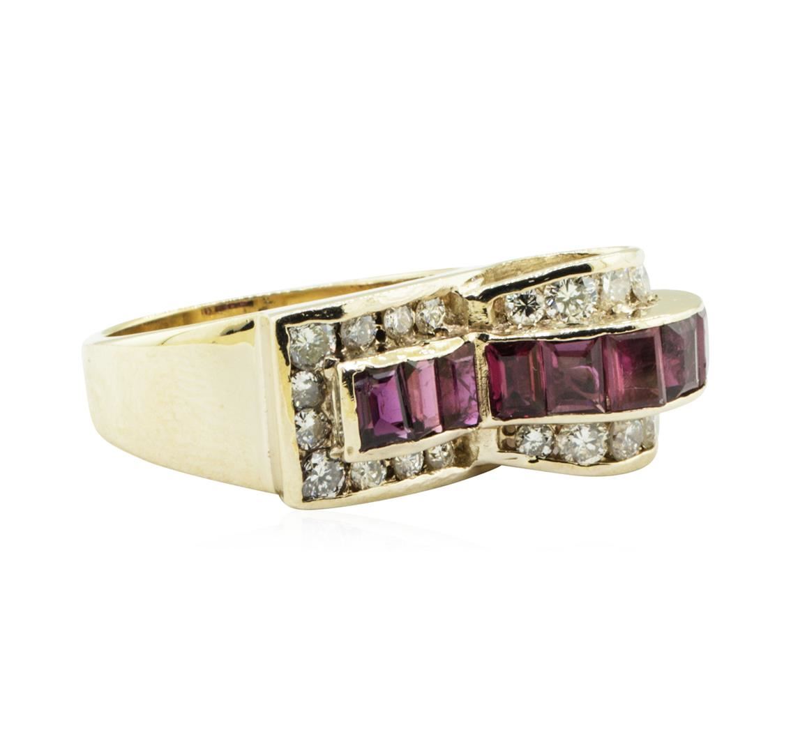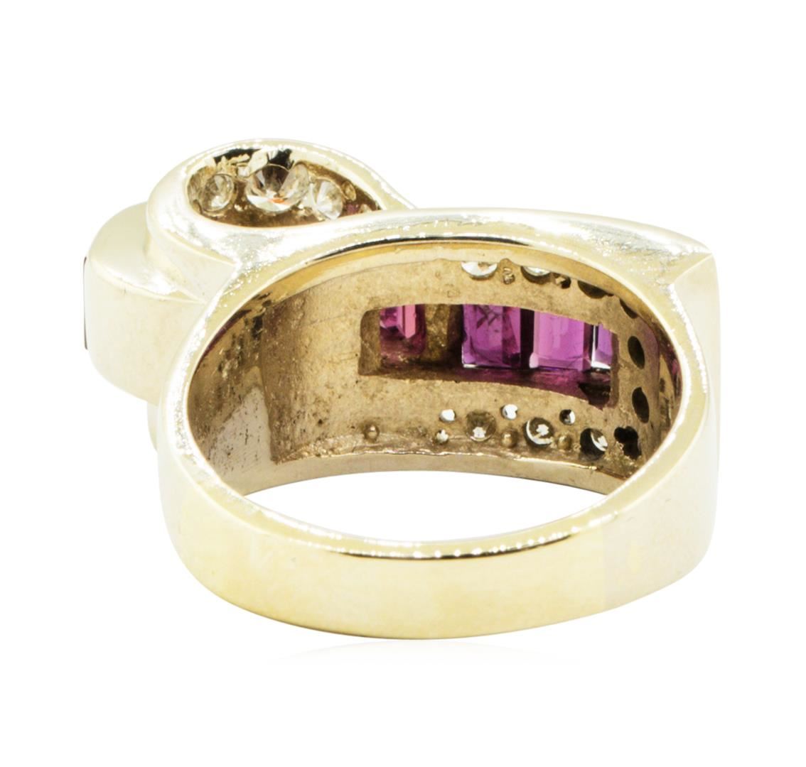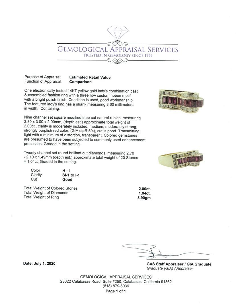 One electronically tested 14KT yellow gold lady's combination cast & assembled fashion ring with a three row custom ribbon motif with a bright polish finish. The featured lady's ring has a shank measuring 3.60 millimeters in width. Condition is used, good workmanship. Containing: Nine channel set square modified step cut natural rubies, measuring 3.80 x 3.00 x 2.00mm, (depth est.) approximate total weight of 2.00ct., clarity is moderately included, medium, moderately strong, strongly purplish red color, (GIA stpR 5/4), cut is good. Transmitting light with a minimum of distortion, transparent. Colored gemstones are presumed to have been subjected to commonly used enhancement processes. Graded in the setting. Twenty channel set round brilliant cut diamonds, measuring 2.70 - 2.10 x 1.49mm (depth est.) approximate total weight of 20 Stones = 1.04ct. Graded in the setting. Color H - I Clarity SI-1 to I-1 Cut Good. Total Weight of Colored Stones 2.00ct.. Total Weight of Diamonds 1.04ct.. Total Weight of Ring 8.90gm GAS Appraised at $4310.00. GAS Appraised.
