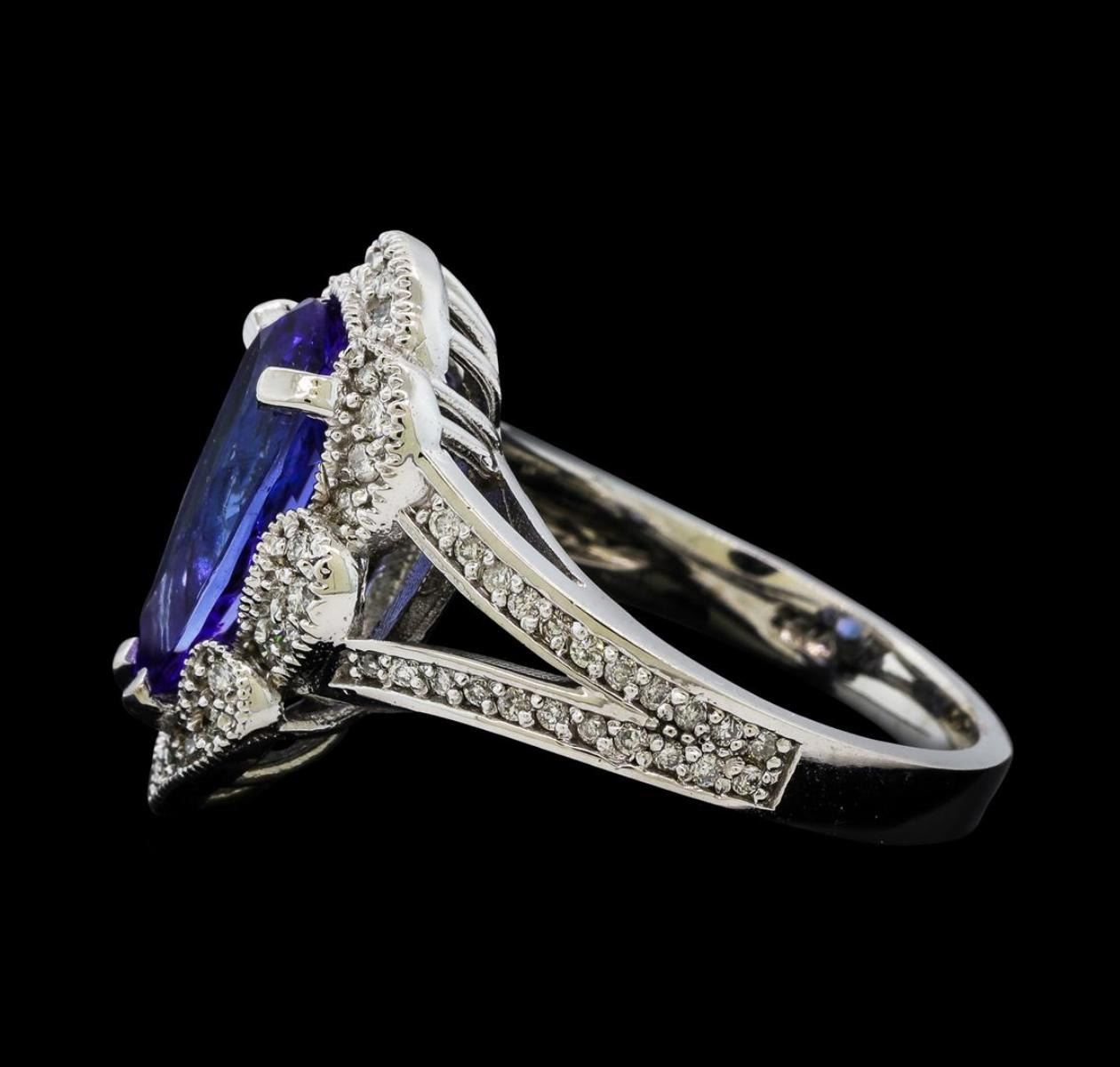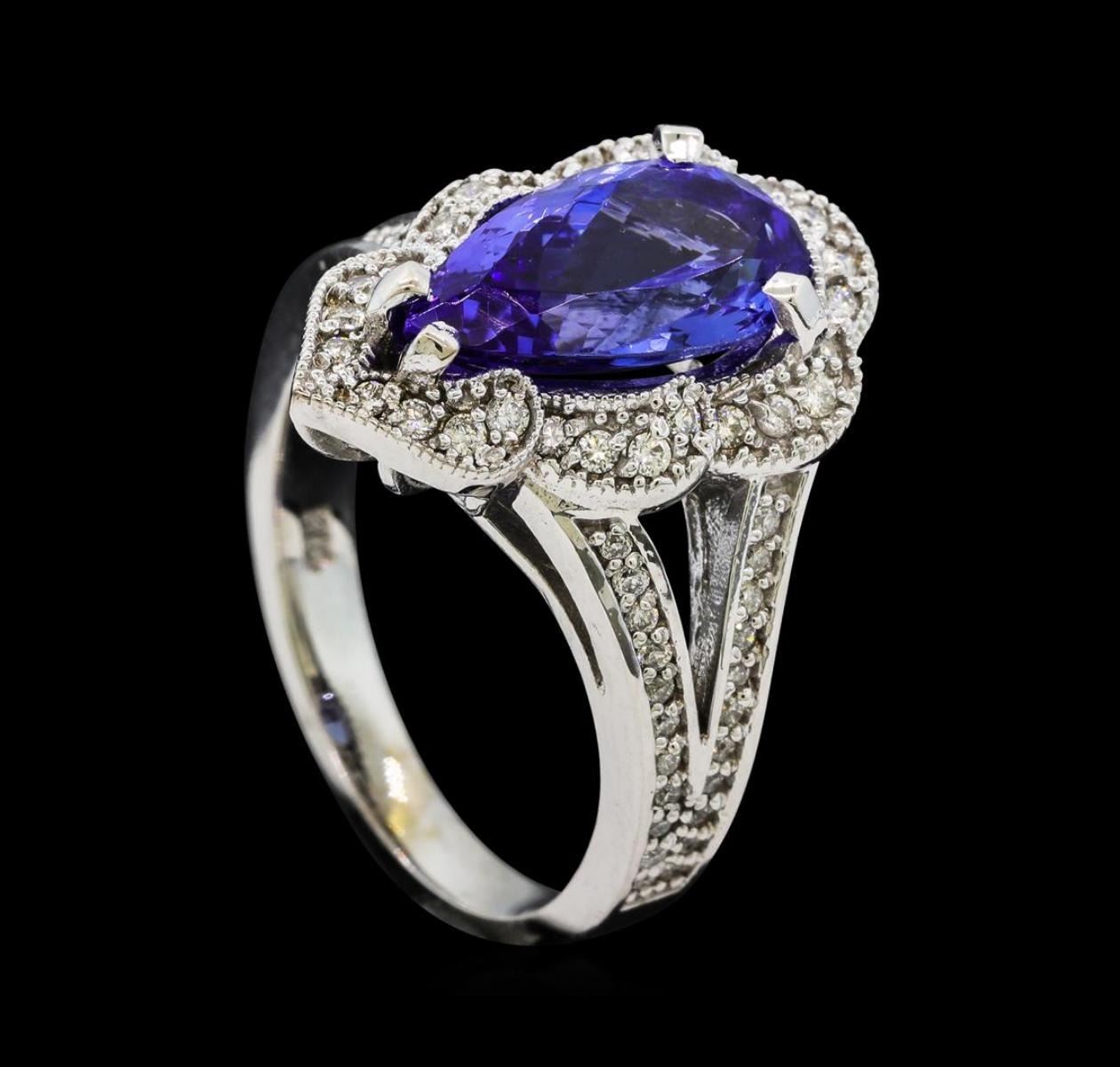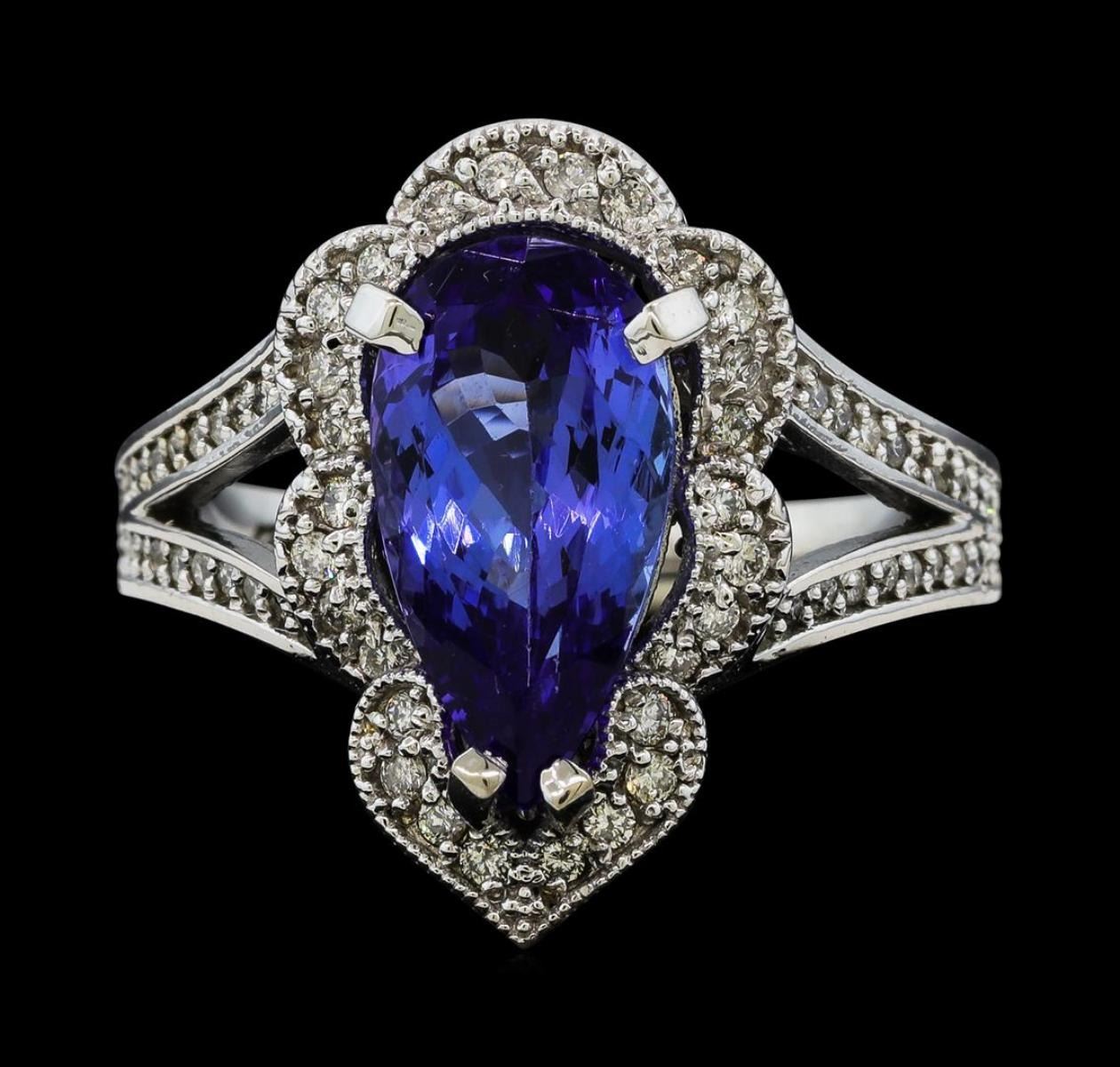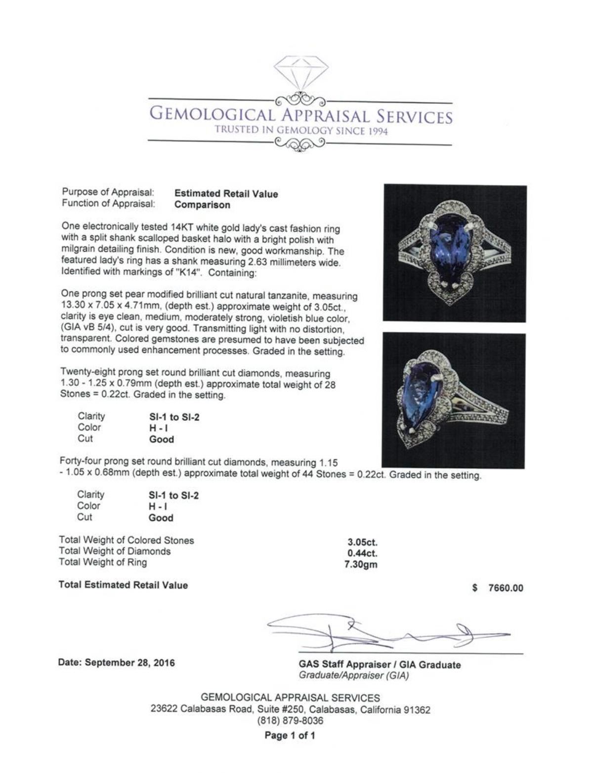 One electronically tested 14KT white gold lady's cast fashion ring with a split shank scalloped basket halo with a bright polish with milgrain detailing finish. The featured lady's ring has a shank measuring 2.63 millimeters wide. Identified with markings of 'K14'. Condition is new, good workmanship. Containing: One prong set pear modified brilliant cut natural tanzanite, measuring 13.30 x 7.05 x 4.71mm, (depth est.) approximate weight of 3.05ct., clarity is eye clean, medium, moderately strong, violetish blue color, (GIA vB 5/4), cut is very good. Transmitting light with no distortion, transparent. Colored gemstones are presumed to have been subjected to commonly used enhancement processes. Graded in the setting. Twenty-Eight prong set round brilliant cut diamonds, measuring 1.30 - 1.25 x 0.79mm (depth est.) approximate total weight of 28 Stones = 0.22ct. Graded in the setting. Clarity SI-1 to SI-2. Color: H - I Cut Good Forty-Four prong set round brilliant cut diamonds, measuring 1.15 - 1.05 x 0.68mm (depth est.) approximate total weight of 44 Stones = 0.22ct. Graded in the setting. Clarity SI-1 to SI-2. Color: H - I Cut Good. Total Weight of Colored Stones 3.05ct.. Total Weight of Diamonds 0.44ct.. Total Weight of Ring 7.30gm.