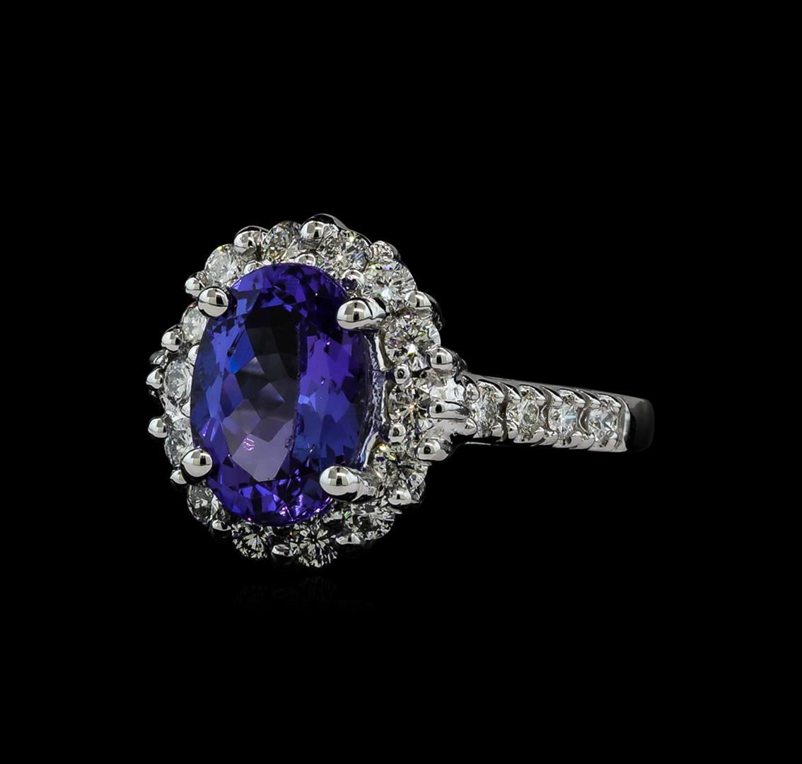 One electronically tested 14KT white gold lady's cast fashion ring with a basket halo with a bright polish finish. The featured lady's ring has a shank measuring 2.06 millimeters wide. Identified with markings of '14K'. Condition is new, good workmanship. Containing: One prong set oval modified brilliant cut natural tanzanite, measuring 10.60 x 7.59 x 5.09mm, (depth est.) 5%. bulge factor, approximate weight of 3.06ct., clarity is eye clean, medium light, very slightly grayish, violetish blue color, (GIA vB 4/3), cut is good. Graded in the setting. Fourteen prong set round brilliant cut diamonds, measuring 2.30 - 2.20 x 1.35mm (depth est.) approximate total weight of 14 Stones = 0.58ct. Graded in the setting. Clarity SI-1 to SI-2. Color: H - I Cut Good Eight prong set round brilliant cut diamonds, measuring 1.80 - 1.70 x 1.07mm (depth est.) approximate total weight of 8 Stones = 0.16ct. Graded in the setting. Clarity SI-1 to I-1. Color: H - I Cut Good. Total Weight of Colored Stones 3.06ct.. Total Weight of Diamonds 0.74ct.. Total Weight of Ring 5.40gm GAS Appraised.
