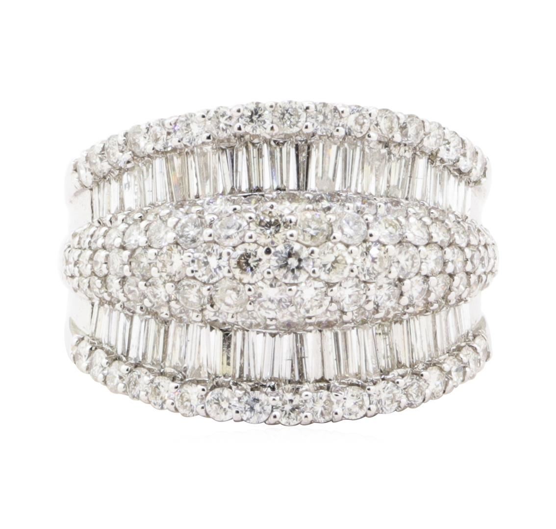 One electronically tested 18KT white gold lady's cast fashion ring with a tapered pave dome with a bright polish finish. The featured lady's ring has a shank measuring 4.00 millimeters wide. Identified with markings of '18K 750'. Condition is new, good workmanship. Containing: Forty-Six channel set baguette cut (tapered) diamonds, measuring from 2.50 x 1.10 x 0.94mm (depth est.) to 2.60 x 1.20 x 1.02mm (depth est.) approximate total weight of 46 Stones = 1.18ct. Graded in the setting. Color H - I Clarity VS-2 to SI-2 Cut Good Ninety prong set round brilliant cut diamonds, measuring 2.20 - 1.40 x 1.08mm (depth est.) approximate total weight of 90 Stones = 1.89ct. Graded in the setting. Color H - I Clarity SI-1 to SI-3 Cut Good. Total Weight of Diamonds 3.07ct.. Total Weight of Ring 8.30gm GAS Appraised at $9305.00. GAS Appraised.