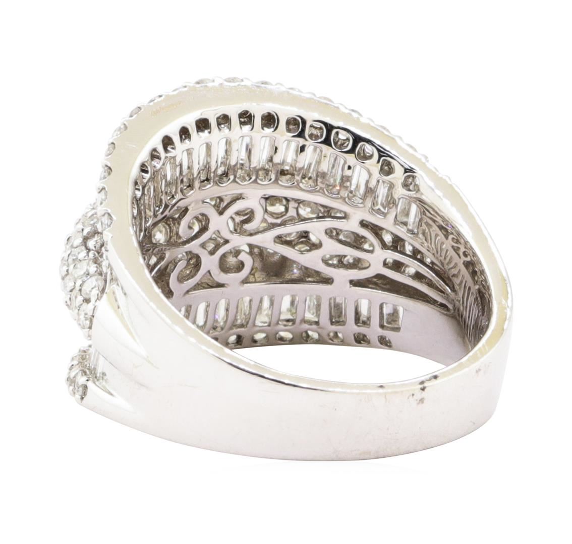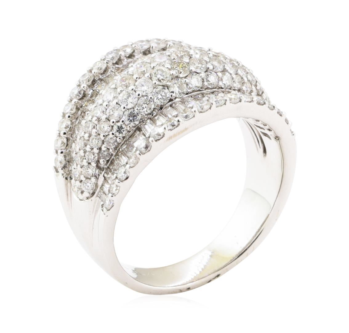 One electronically tested 18KT white gold lady's cast fashion ring with a tapered pave dome with a bright polish finish. The featured lady's ring has a shank measuring 4.00 millimeters wide. Identified with markings of '18K 750'. Condition is new, good workmanship. Containing: Forty-Six channel set baguette cut (tapered) diamonds, measuring from 2.50 x 1.10 x 0.94mm (depth est.) to 2.60 x 1.20 x 1.02mm (depth est.) approximate total weight of 46 Stones = 1.18ct. Graded in the setting. Color H - I Clarity VS-2 to SI-2 Cut Good Ninety prong set round brilliant cut diamonds, measuring 2.20 - 1.40 x 1.08mm (depth est.) approximate total weight of 90 Stones = 1.89ct. Graded in the setting. Color H - I Clarity SI-1 to SI-3 Cut Good. Total Weight of Diamonds 3.07ct.. Total Weight of Ring 8.30gm GAS Appraised at $9305.00. GAS Appraised.
