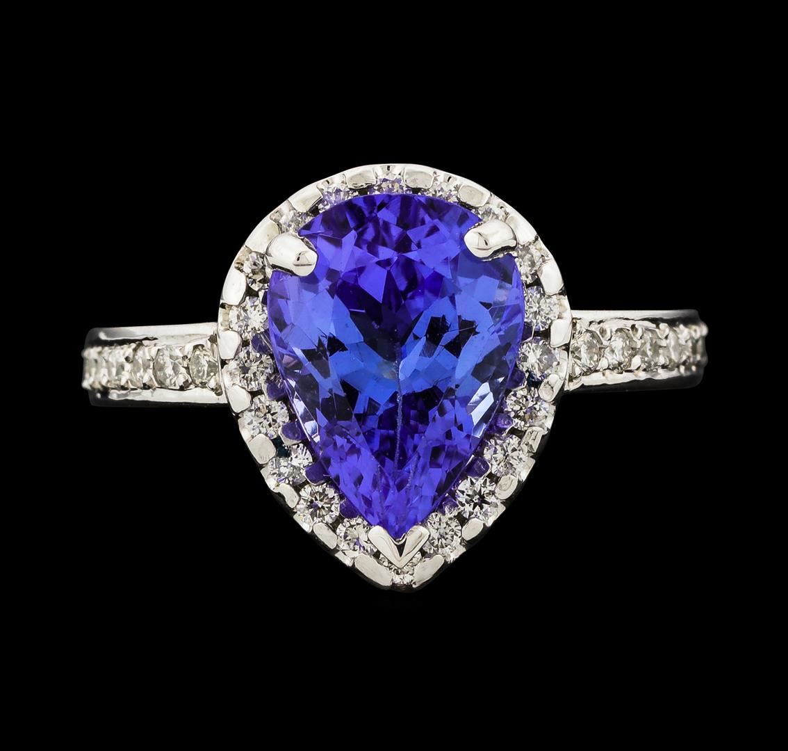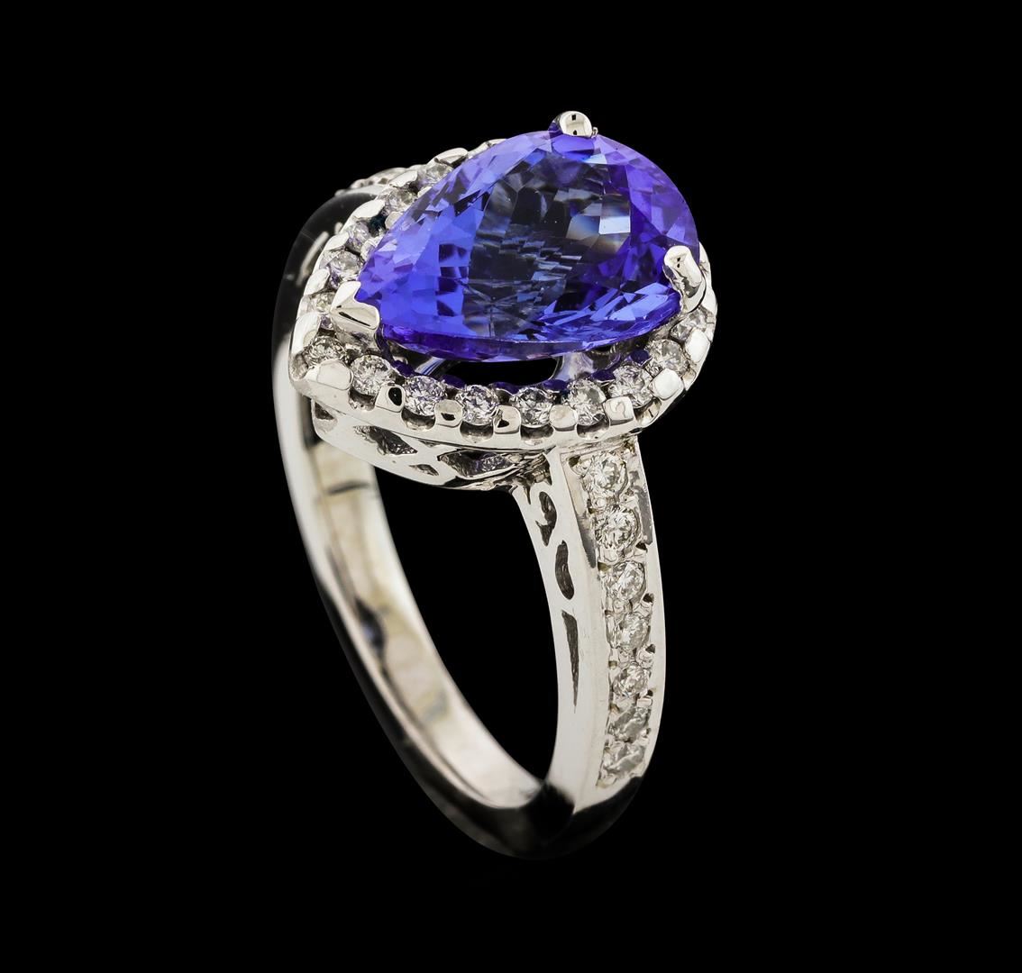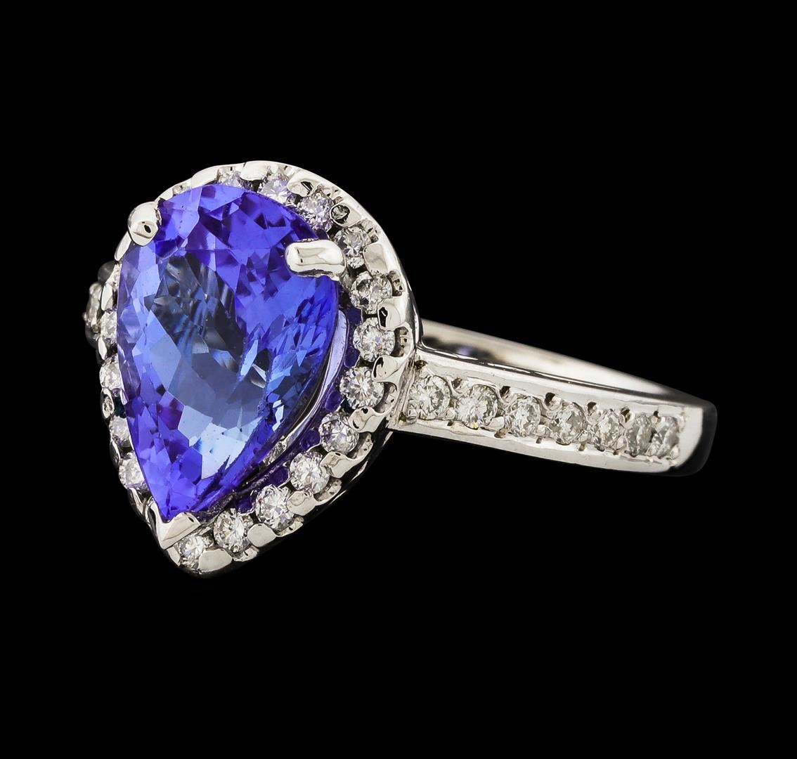 One electronically tested 14KT white gold lady's cast fashion ring with a cathedral shank with a halo with a bright polish finish. The featured lady's ring has a shank measuring 2.22 millimeters wide. Identified with markings of '14K'. Condition is new, good workmanship. Containing: One prong set pear modified brilliant cut natural tanzanite, measuring 11.10 x 8.20 x 5.46mm, (depth est.) approximate weight of 3.07ct., clarity is eye clean, medium light, moderately strong, violetish blue color, (GIA vB 4/4), cut is good. Transmitting light with no distortion, transparent. Colored gemstones are presumed to have been subjected to commonly used enhancement processes. Graded in the setting. Thirty-Four prong set round brilliant cut diamonds, measuring 1.50 - 1.40 x 0.90mm (depth est.) approximate total weight of 34 Stones = 0.40ct. Graded in the setting. Clarity SI-1 to SI-2. Color: G - I Cut Good. Total Weight of Colored Stones 3.07ct.. Total Weight of Diamonds 0.40ct.. Total Weight of Ring 5.50gm. GAS Appraised.