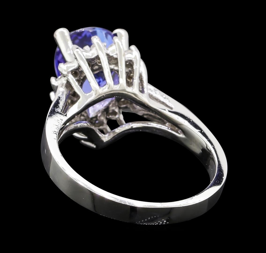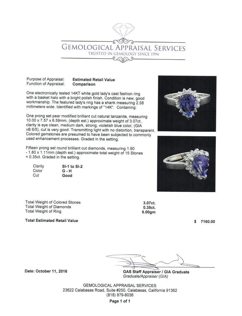 One electronically tested 14KT white gold lady's cast fashion ring with a basket halo with a bright polish finish. The featured lady's ring has a shank measuring 2.58 millimeters wide. Identified with markings of '14K'. Condition is new, good workmanship. Containing: One prong set pear modified brilliant cut natural tanzanite, measuring 10.00 x 7.57 x 6.59mm, (depth est.) approximate weight of 3.07ct., clarity is eye clean, medium dark, strong, violetish blue color, (GIA vB 6/5), cut is very good. Transmitting light with no distortion, transparent. Colored gemstones are presumed to have been subjected to commonly used enhancement processes. Graded in the setting. Fifteen prong set round brilliant cut diamonds, measuring 1.90 - 1.80 x 1.11mm (depth est.) approximate total weight of 15 Stones = 0.35ct. Graded in the setting. Clarity SI-1 to SI-2. Color: G - H Cut Good. Total Weight of Colored Stones 3.07ct.. Total Weight of Diamonds 0.35ct.. Total Weight of Ring 6.00gm.