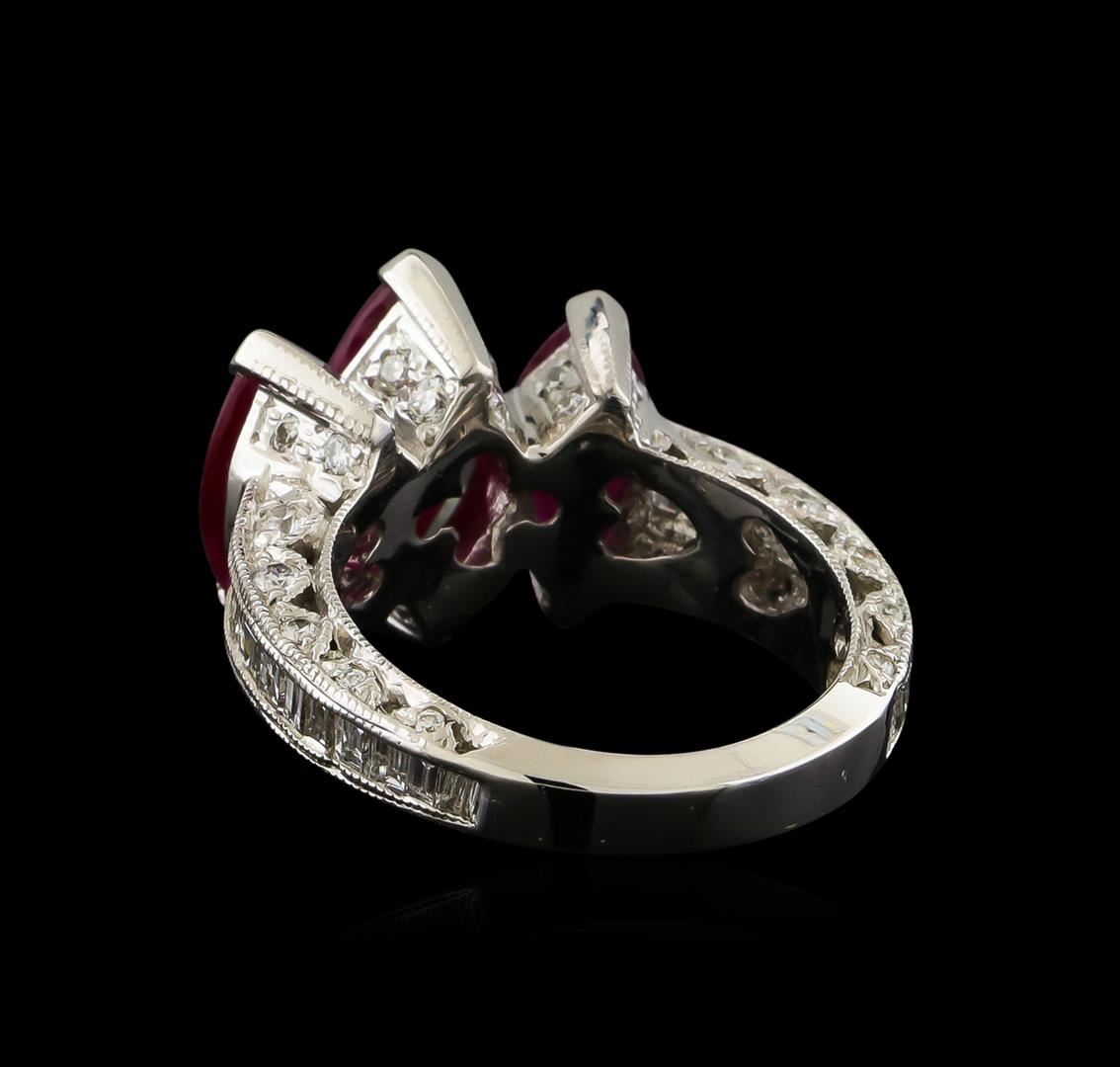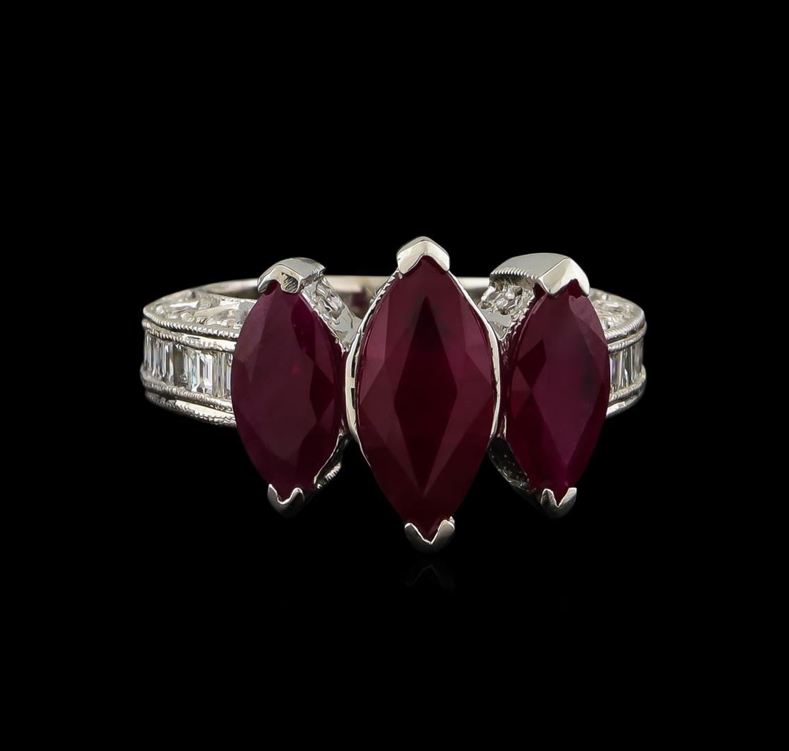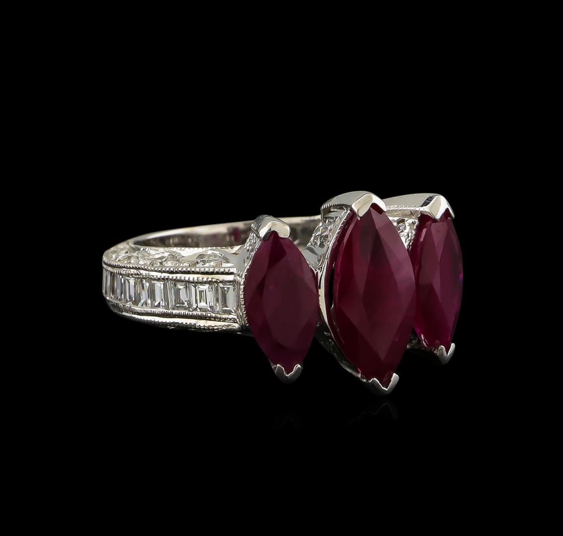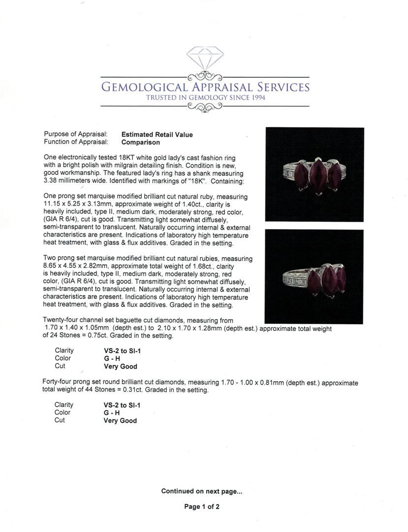 One electronically tested 18KT white gold lady's cast fashion ring with a bright polish with milgrain detailing finish. The featured lady's ring has a shank measuring 3.38 millimeters wide. Identified with markings of "18K". Condition is new, good workmanship. Containing: One prong set marquise modified brilliant cut natural ruby, measuring 11.15 x 5.25 x 3.13mm, approximate weight of 1.40ct., clarity is heavily included, type II, medium dark, moderately strong, red color, (GIA R 6/4), cut is good. Transmitting light somewhat diffusely, semi-transparent to translucent. Naturally occurring internal & external characteristics are present. Indications of laboratory high temperature heat treatment, with glass & flux additives. Graded in the setting. Two prong set marquise modified brilliant cut natural rubies, measuring 8.65 x 4.55 x 2.82mm, approximate total weight of 1.68ct., clarity is heavily included, type II, medium dark, moderately strong, red color, (GIA R 6/4), cut is good. Transmitting light somewhat diffusely, semi-transparent to translucent. Naturally occurring internal & external characteristics are present. Indications of laboratory high temperature heat treatment, with glass & flux additives. Graded in the setting. Twenty-Four channel set baguette cut diamonds, measuring from 1.70 x 1.40 x 1.05mm (depth est.) to 2.10 x 1.70 x 1.28mm (depth est.) approximate total weight of 24 Stones = 0.75ct. Graded in the setting. Clarity: VS-2 to SI-1. Color: G - Very Good Forty-Four prong set round brilliant cut diamonds, measuring 1.70 - 1.00 x 0.81mm (depth est.) approximate total weight of 44 Stones = 0.31ct. Graded in the setting. Clarity: VS-2 to SI-1. Color: G - Very Good. Total Weight of Colored Stones 3.08ct. Total Weight of Diamonds 1.06ct. Total Weight of Ring 6.80gm GAS Appraised.