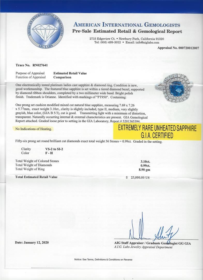 One 3.10ct Sapphire and Diamond Ring - Platinum. AIG certified. See Appraisal for more details. AIG Appraised.
