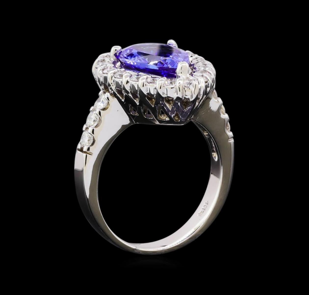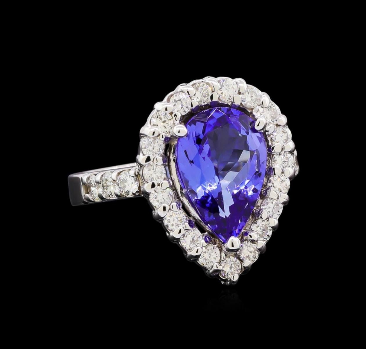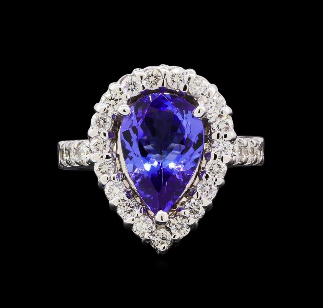 One electronically tested 14KT white gold lady's cast fashion ring with a basket halo with a bright polish finish. The featured lady's ring has a shank measuring 3.15 millimeters in width. Identified with markings of "K14". Condition is new, good workmanship. Containing: One prong set pear modified brilliant cut natural tanzanite, measuring 12.55 x 8.98 x 4.60mm, (depth est.) approximate weight of 3.10ct., clarity is eye clean, medium, moderately strong, bluish violet color, (GIA bV 5/4), cut is very good. Transmitting light with no distortion, transparent. Colored gemstones are presumed to have been subjected to commonly used enhancement processes. Graded in the setting. Six prong set round brilliant cut diamonds, measuring 2.50 - 2.40 x 1.47mm (depth est.) approximate total weight of 6 Stones = 0.30ct. Graded in the setting. Graded in the setting. Clarity: SI-1 to SI-2. Color: G - Good Nineteen prong set round brilliant cut diamonds, measuring 2.20 - 2.10 x 1.31mm (depth est.) approximate total weight of 19 Stones = 0.65ct. Graded in the setting. Clarity: SI-1 to SI-2. Color: H - I. Cut Good. Total Weight of Colored Stones 3.10ct. Total Weight of Diamonds 0.95ct. Total Weight of Ring 8.10gm.