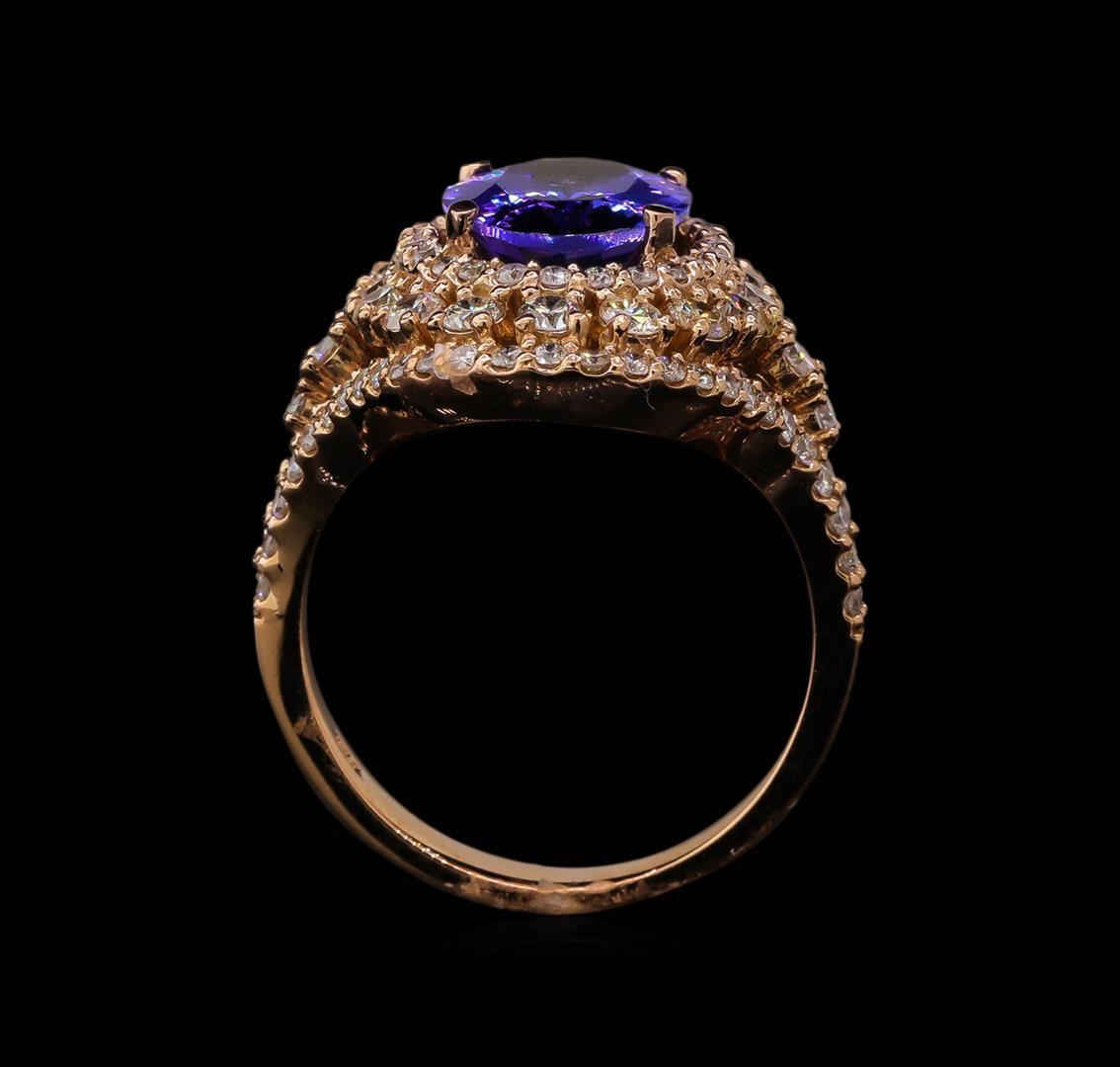 One electronically tested 14KT rose gold lady's cast fashion ring with a split shank triple halo with a bright polish finish. The featured lady's ring has a shank measuring 3.58 millimeters wide. Identified with markings of 'K14'. Condition is new, good workmanship. Containing: One prong set oval modified brilliant cut natural tanzanite, measuring 11.20 x 8.51 x 5.00mm, (depth est.) approximate weight of 3.11ct., clarity is eye clean, medium dark, very slightly grayish, violetish blue color, (GIA vB 6/3), cut is very good. Transmitting light with no distortion, transparent. Colored gemstones are presumed to have been subjected to commonly used enhancement processes. Graded in the setting. Eighteen prong set round brilliant cut diamonds, measuring 2.30 - 2.20 x 1.35mm (depth est.) approximate total weight of 18 Stones = 0.75ct. Graded in the setting. Clarity SI-1 to SI-2. Color: H - I Cut Good Two prong set round brilliant cut diamonds, measuring 1.90 - 1.85 x 1.17mm (depth est.) approximate total weight of 2 Stones = 0.05ct. Graded in the setting. Clarity SI-1 to SI-2. Color: H Cut Good Seventy-Eight prong set round brilliant cut diamonds, measuring 1.30 - 1.20 x 0.78mm (depth est.) approximate total weight of 78 Stones = 0.57ct. Graded in the setting. Clarity SI-1 to I-1. Color: G - H Cut Good. Total Weight of Colored Stones 3.11ct. Total Weight of Diamonds 1.37ct. Total Weight of Ring 8.10gm. GAS Appraised.