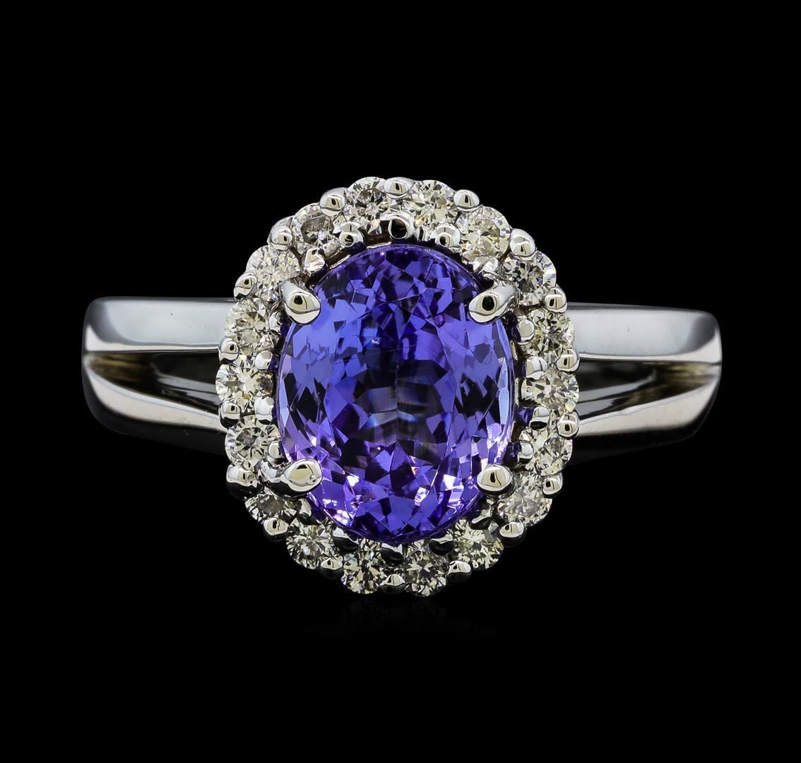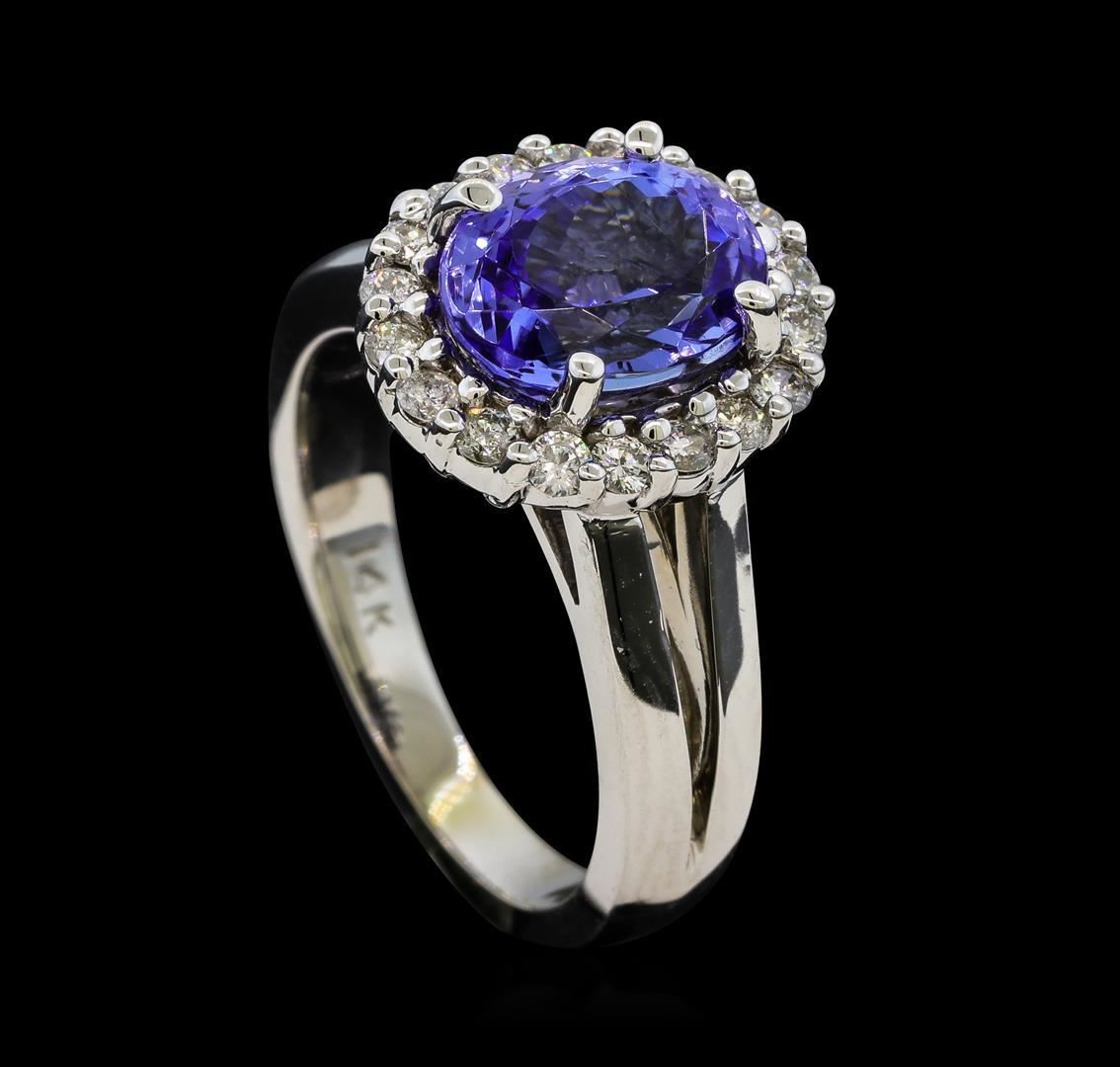 One electronically tested 14KT white gold lady's cast fashion ring with a split shank basket halo with a bright polish finish. The featured lady's ring has a shank measuring 2.65 millimeters wide. Identified with markings of '14K'. Condition is new, good workmanship. Containing: One prong set oval modified brilliant cut natural tanzanite, measuring 9.68 x 7.69 x 5.50mm, (depth est.) 8%. bulge factor, approximate weight of 3.11ct., clarity is eye clean, medium, moderately strong, violet color, (GIA V 5/4), cut is very good. Transmitting light with no distortion, transparent. Colored gemstones are presumed to have been subjected to commonly used enhancement processes. Graded in the setting. Eighteen prong set round brilliant cut diamonds, measuring 1.90 - 1.85 x 1.17mm (depth est.) approximate total weight of 18 Stones = 0.46ct. Graded in the setting. Clarity SI-1 to SI-2. Color: G - H Cut Good. Total Weight of Colored Stones 3.11ct.. Total Weight of Diamonds 0.46ct.. Total Weight of Ring 7.30gm.