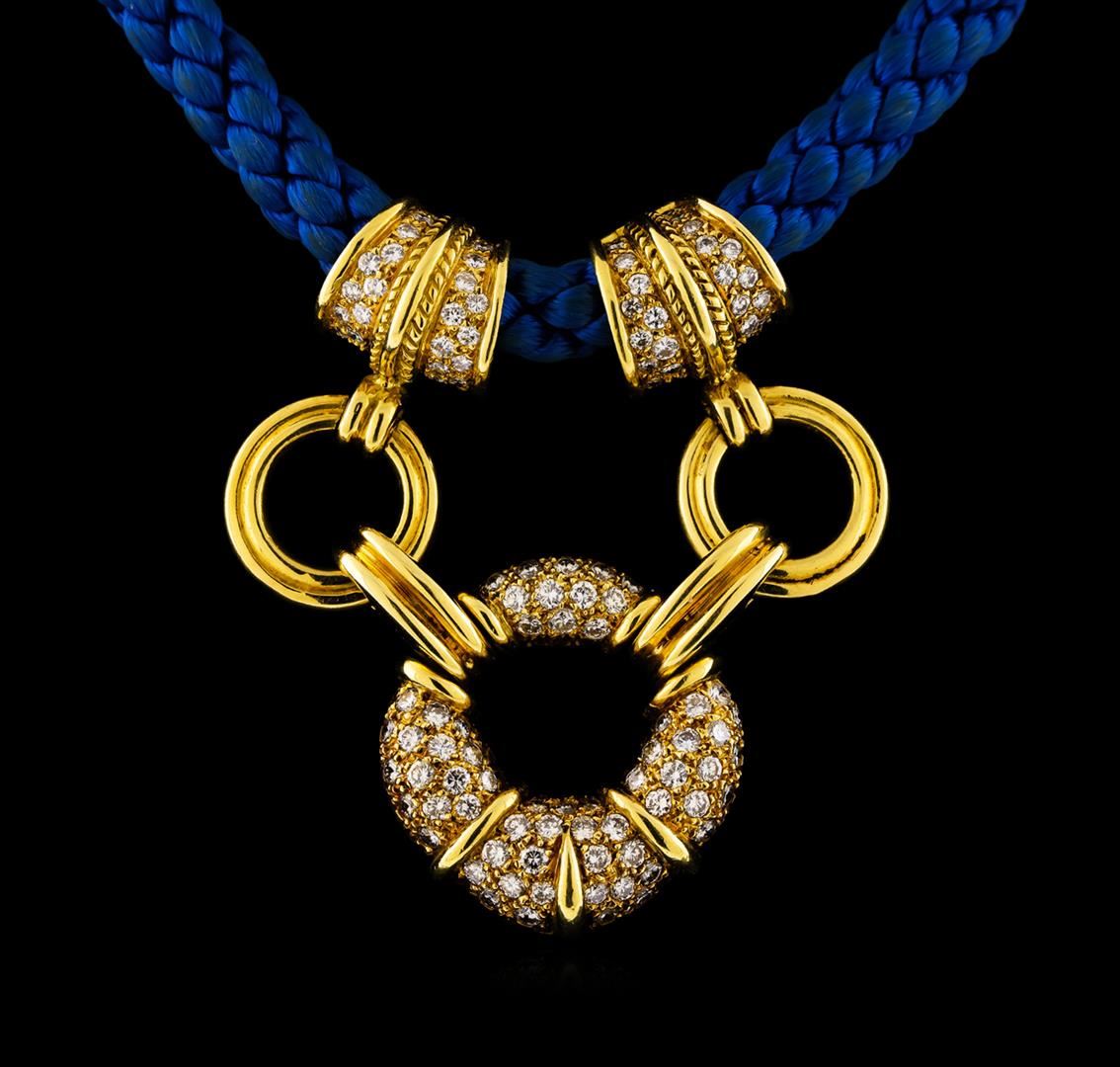 One electronically tested 18KT yellow gold ladies cast & assembled diamond necklace. The fourteen and one half inch wearable length necklace featuring a diamond pendant and silk rope is reminiscent of a nautical style. The three inch length pendant features a diamond set 'Lifesaver' set between grooved links completed by diamond set hinged snap locking clasps that allow the pendant to attach or detach from the rope. The pendant is supported by a fifteen inch length navy blue silk rope terminating in knotted ends. Bright and patterned finish. Condition is good. Containing: One Hundred Eleven prong set round brilliant cut diamonds, measuring 2.10 - 1.80 x 1.17mm (depth est.) approximate total weight of 111 Stones = 3.12ct. Graded in the setting. Clarity VVS-2 to VS-2. Color: E - G. Total Weight of Diamonds 3.12ct.. Total Weight of Necklace 43.37gm. AIG Appraised at $21,390.00.